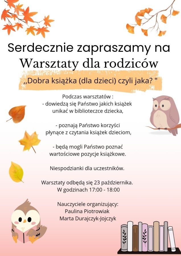 serdecznie zapraszamy na warsztaty dla Państwa pt.„Dobra książka (dla dzieci) – czyli jaka?”