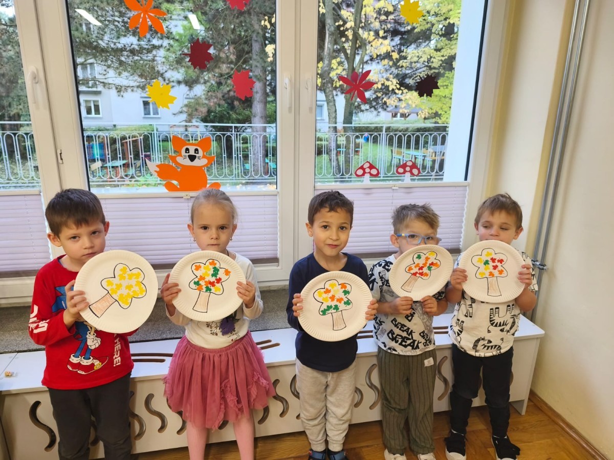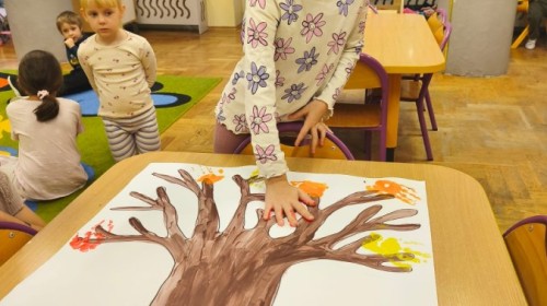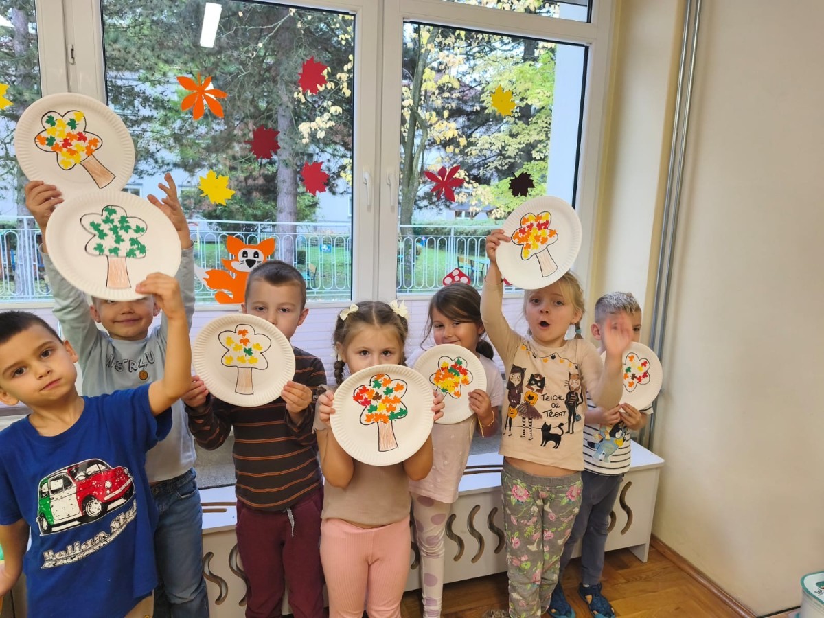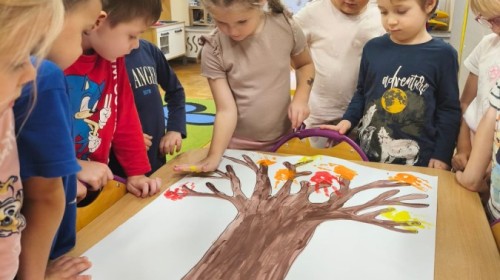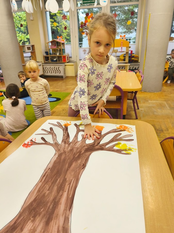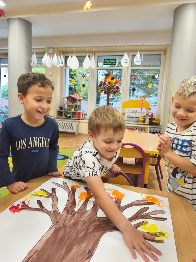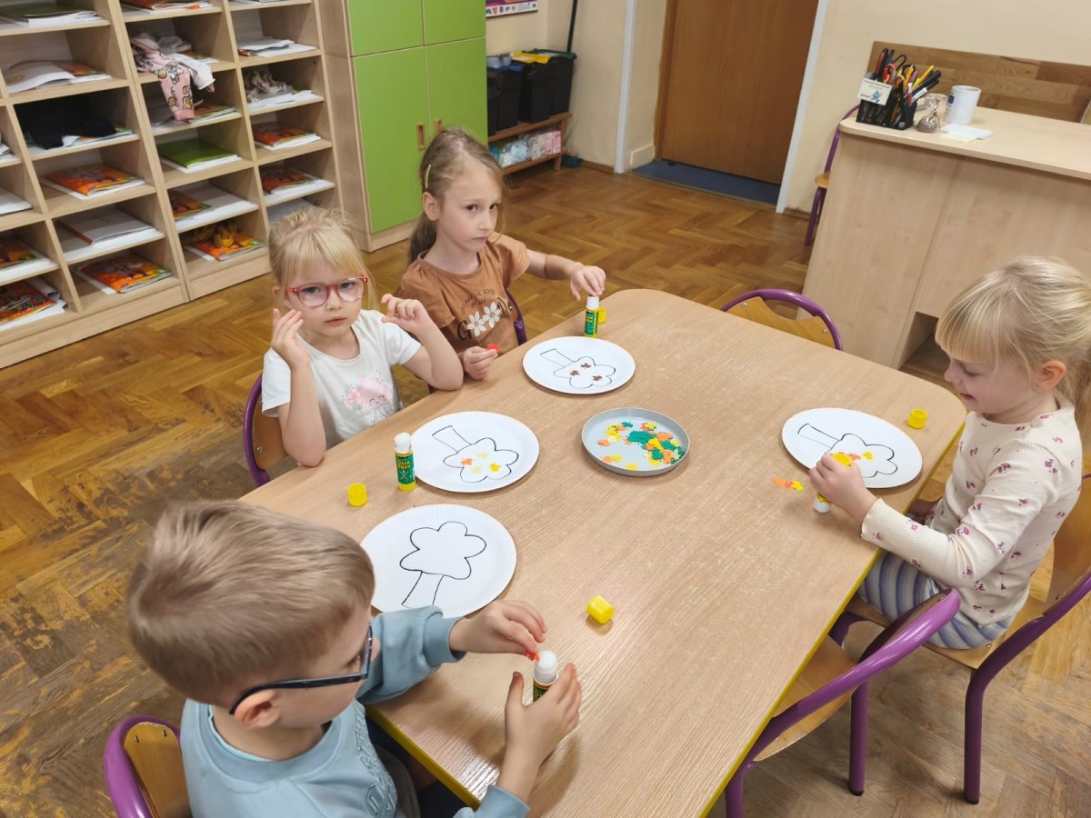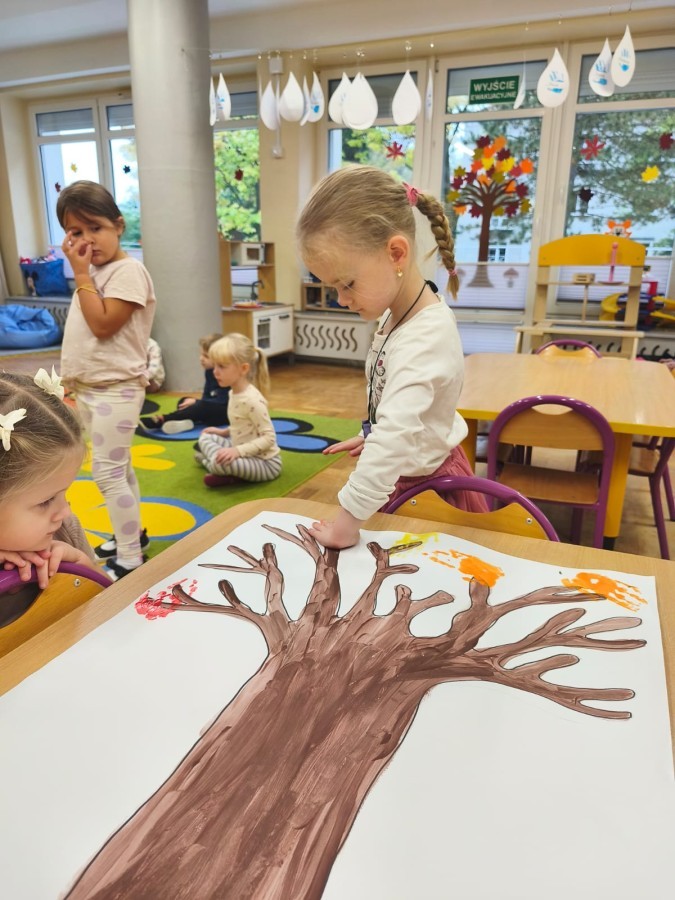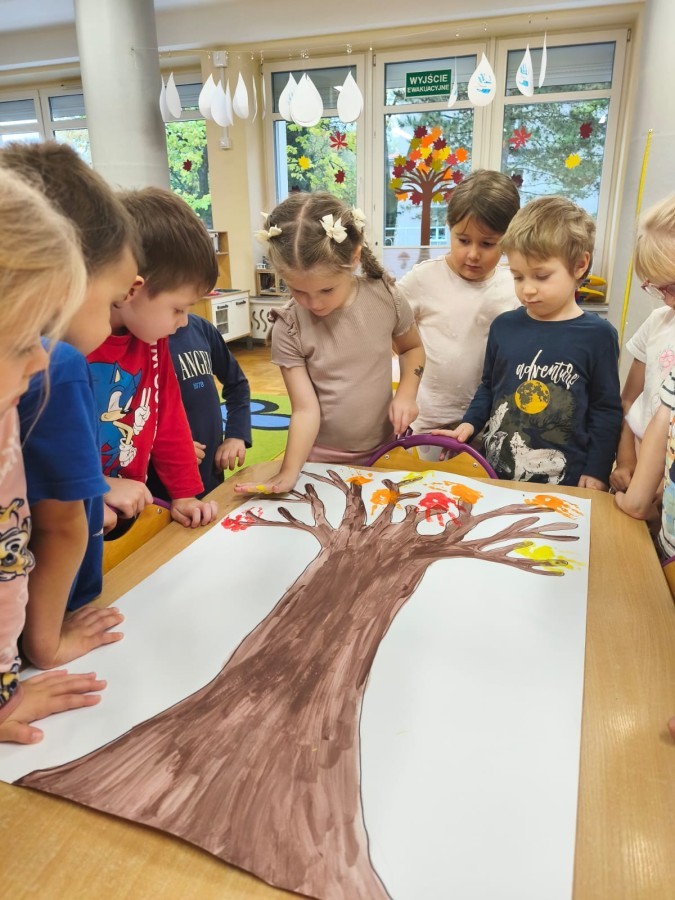 10 października obchodzimy Dzień drzewa, z tej okazji Kropelki poznały ciekawostki dotyczące drzew, przypomniały sobie ich najpopularniejsze odmiany, wykonały grupowe drzewko oraz pracę plastyczną. Niestety pogoda nie sprzyjała spacerom, dlatego piękne drzewa rosnące w naszym ogrodzie przedszkolnym, tym razem podziwialiśmy jedynie przez okna.