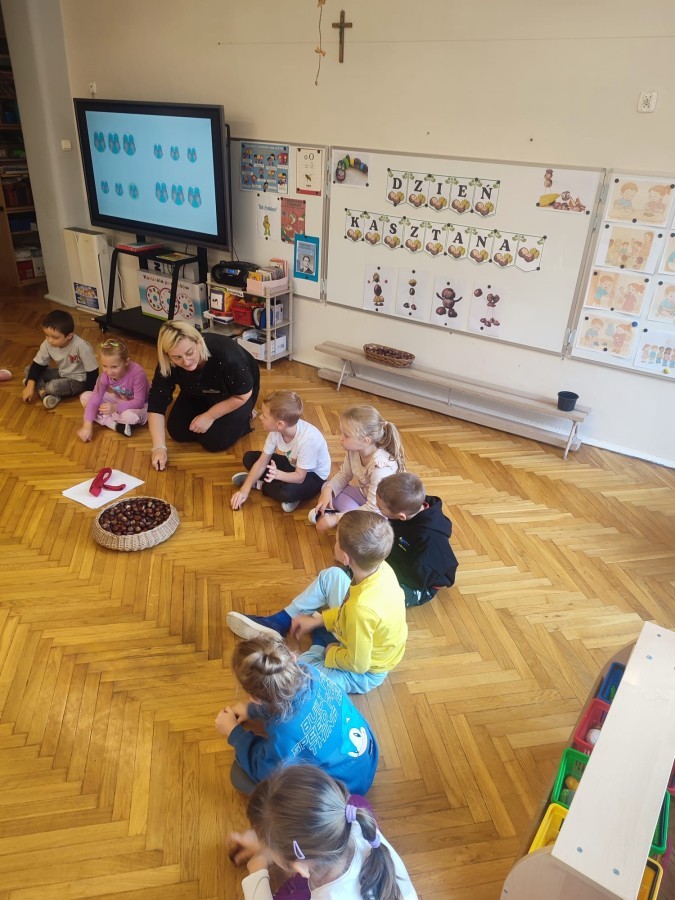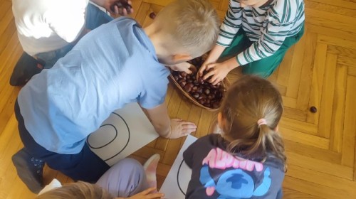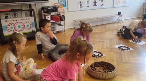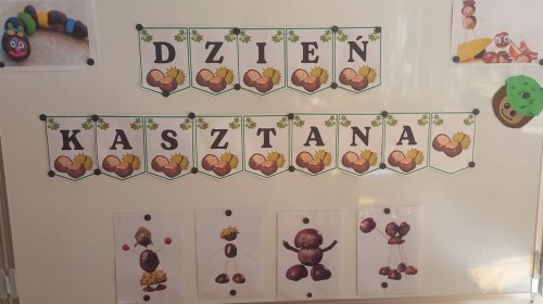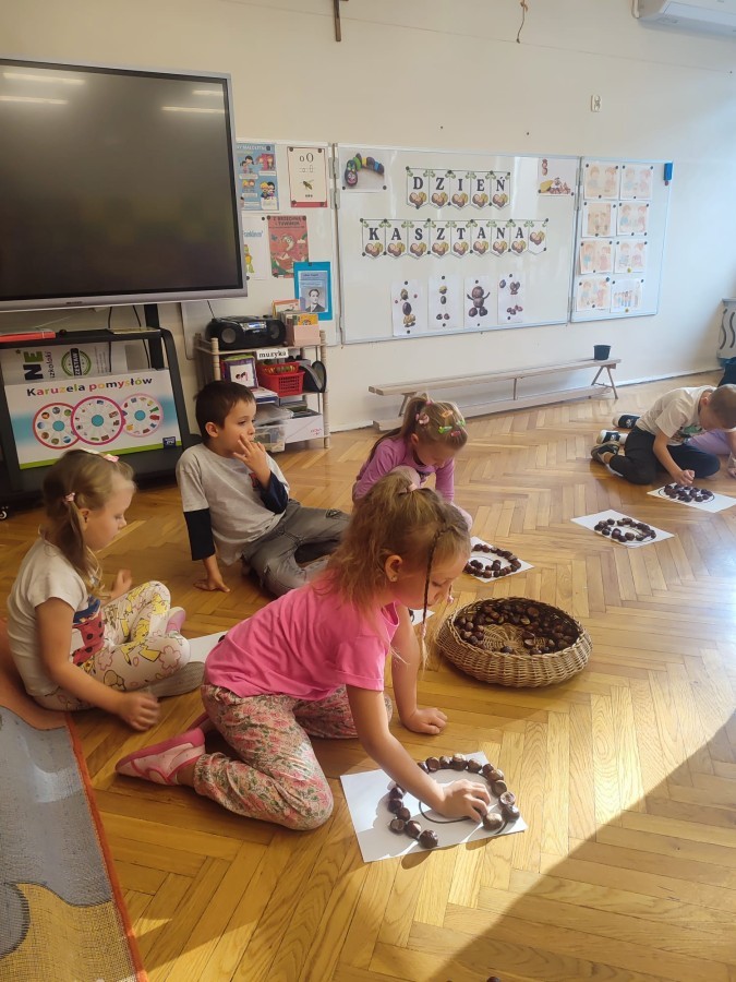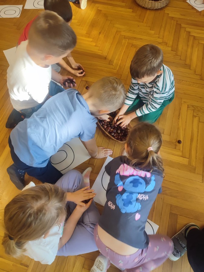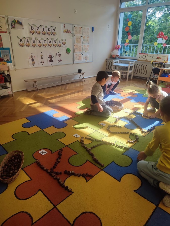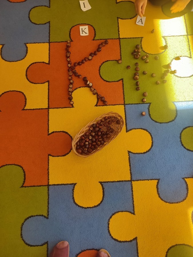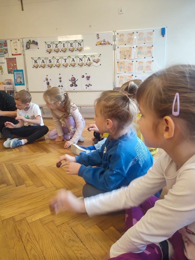 Wystukiwanie rytmu piosenki🎶 z wykorzystaniem kasztanów, "znajdź kasztana" - zajęcia ruchowe👣, "Przekaż dalej" - zajęcia w kole z kasztanami🤝, "O jak..." - układanie litery "o" z kasztanów, "mój kasztan" - zajęcia plastyczno-techniczne✂️🖌, "Kasztanki" - praca w zespołach, tworzenie napisu grupowego, odwzorowywanie liter🗒, "w poszukiwaniu kasztanów" - zajęcia na świeżym powietrzu :)🌰🌰🌰... działo się😁👐