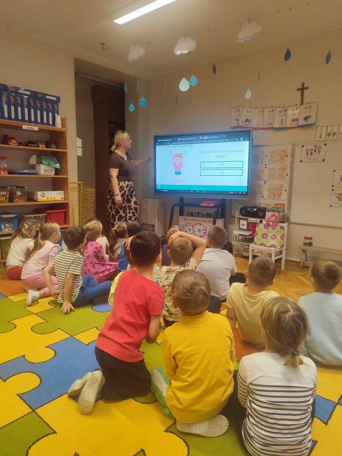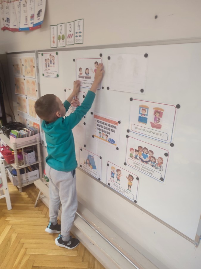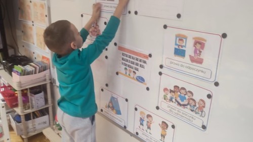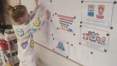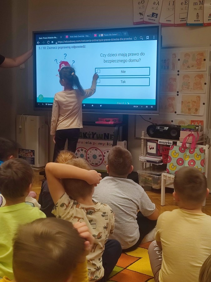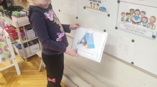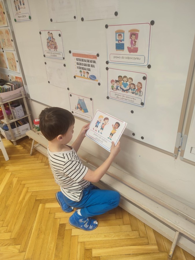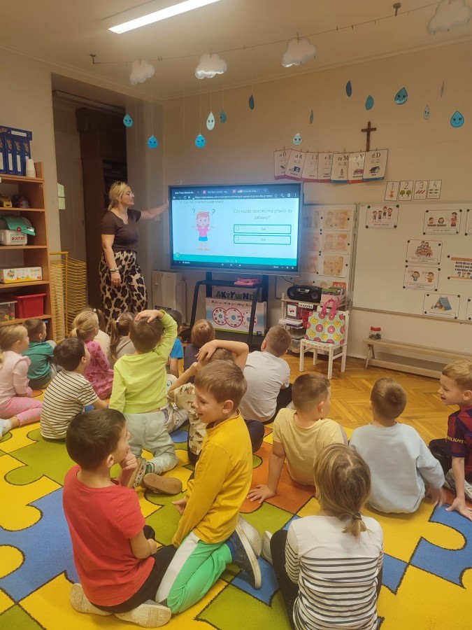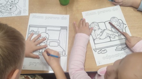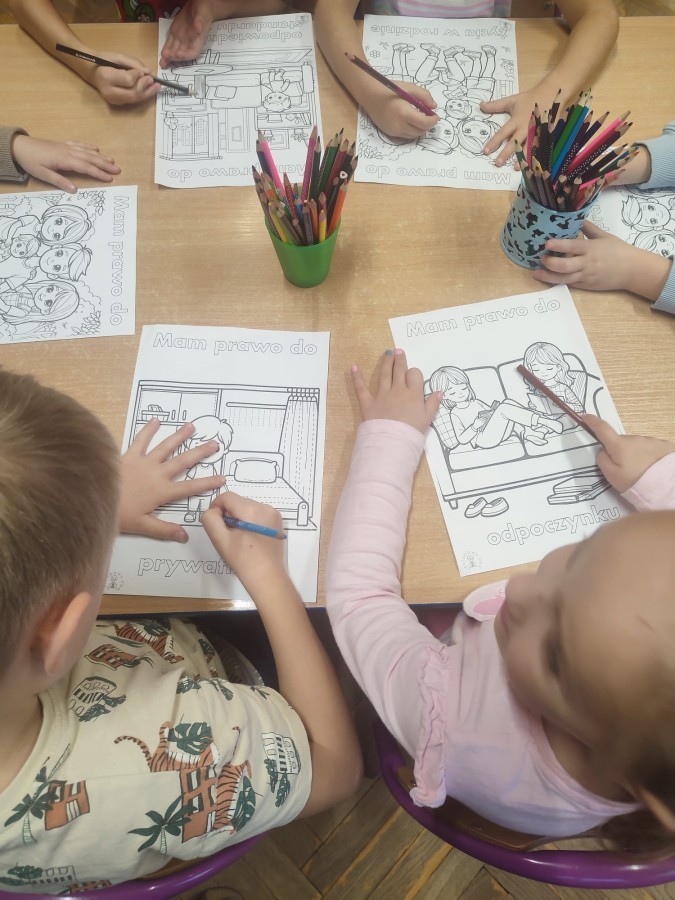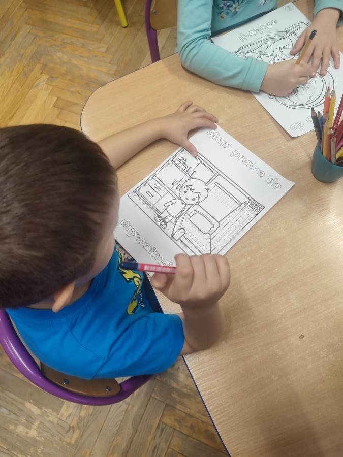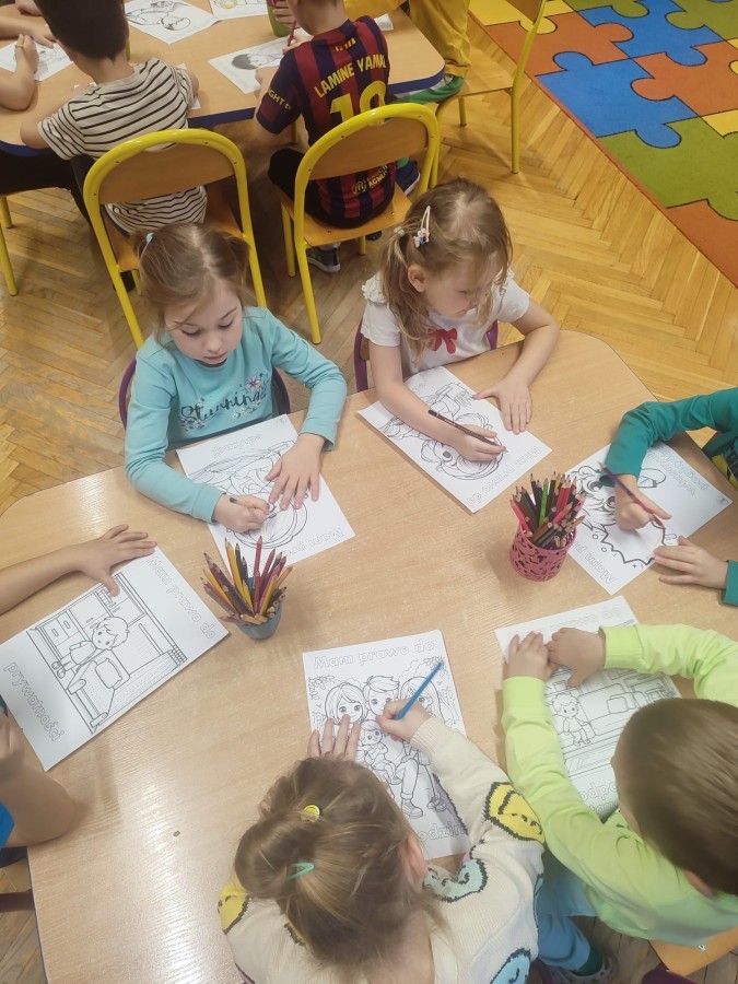 "O prawach dziecka" - wysłuchanie wiersza M. Brykczyńskiego i rozmowa na temat jego treści. "Quiz o prawach dziecka" -z wykorzystaniem tablicy multimedialnej . "Moje prawa" - kolorowanie wybranej przez dziecko kolorowanki dotyczącej praw dziecka przy piosence "Prawa dziecka".