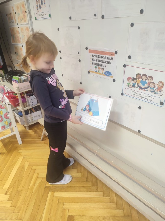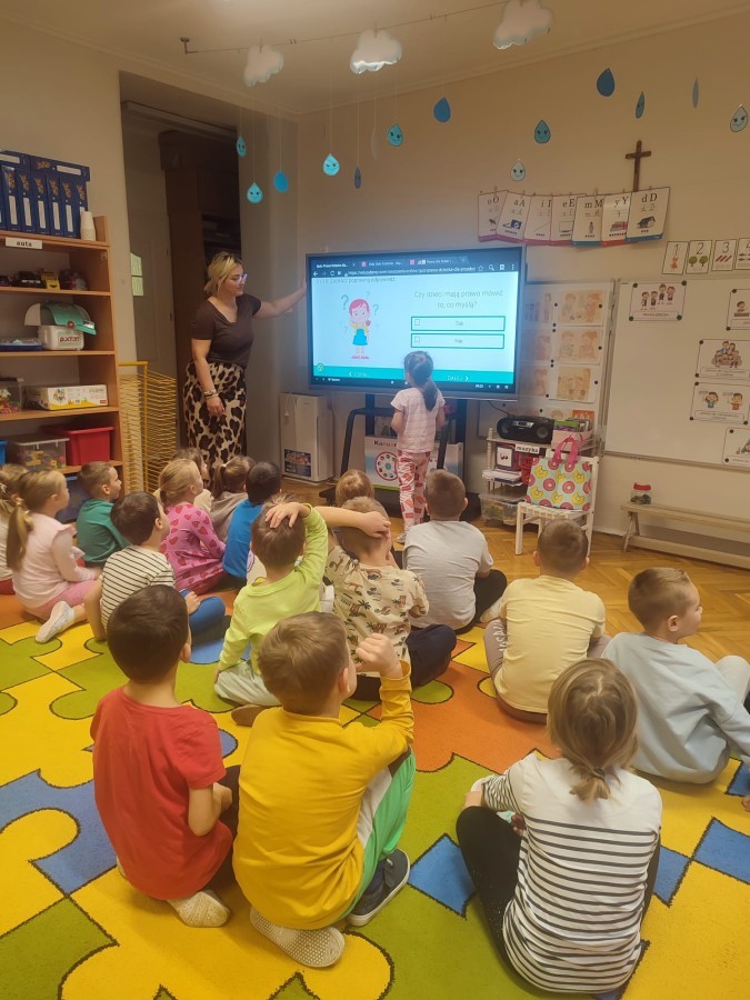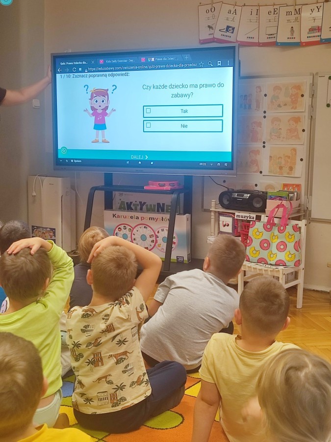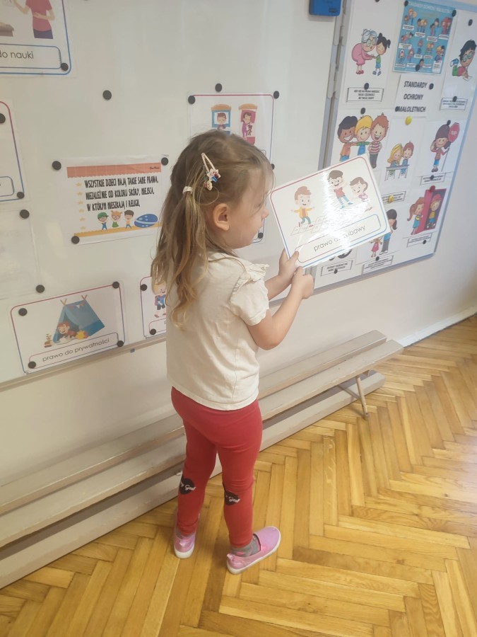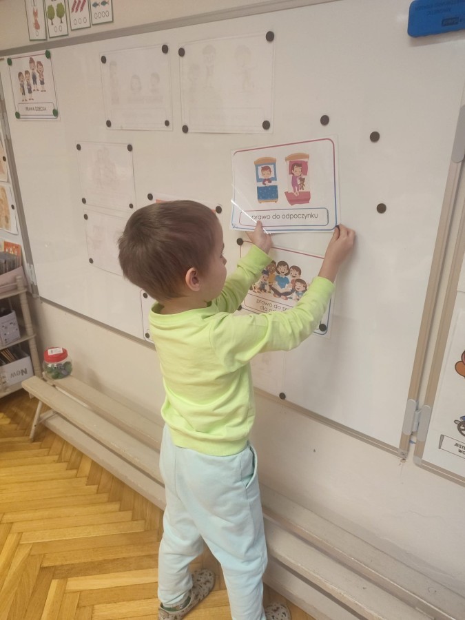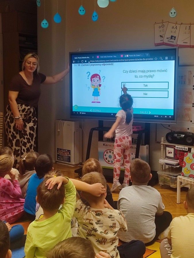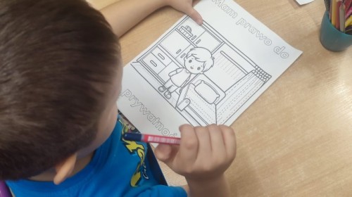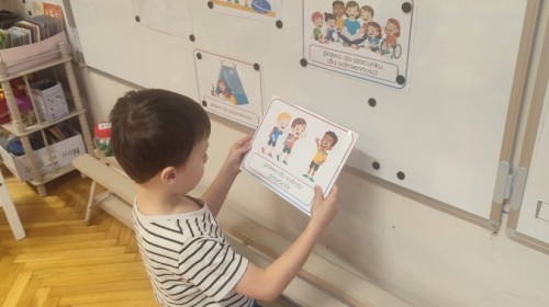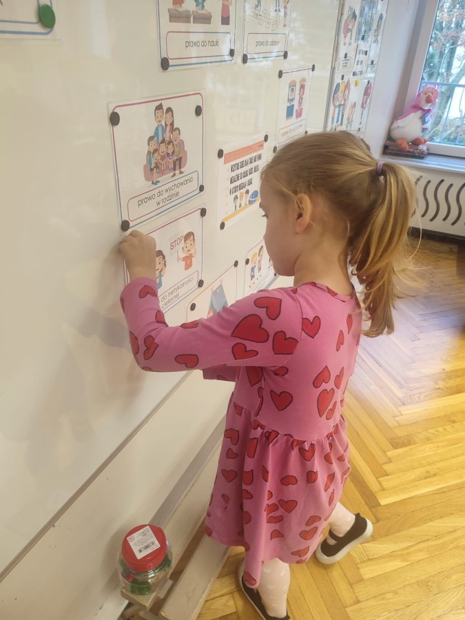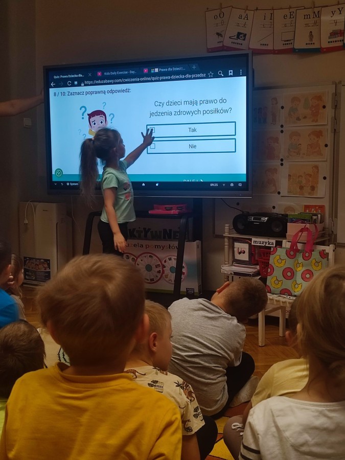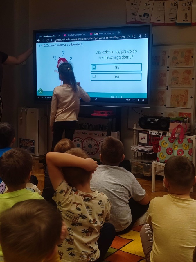 "O prawach dziecka" - wysłuchanie wiersza M. Brykczyńskiego i rozmowa na temat jego treści. "Quiz o prawach dziecka" -z wykorzystaniem tablicy multimedialnej . "Moje prawa" - kolorowanie wybranej przez dziecko kolorowanki dotyczącej praw dziecka przy piosence "Prawa dziecka".