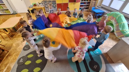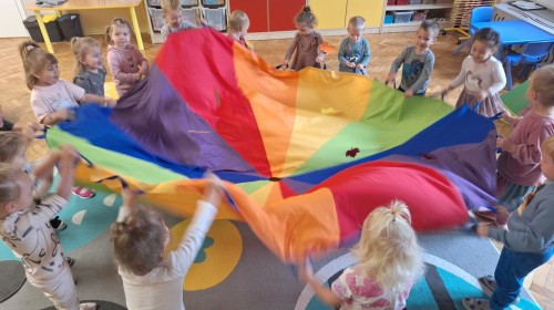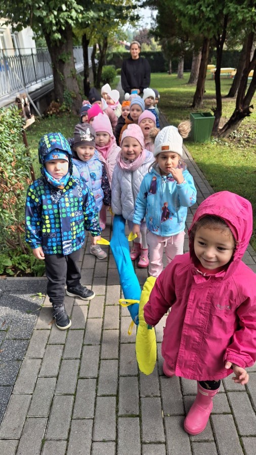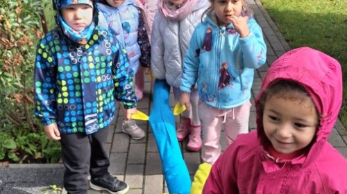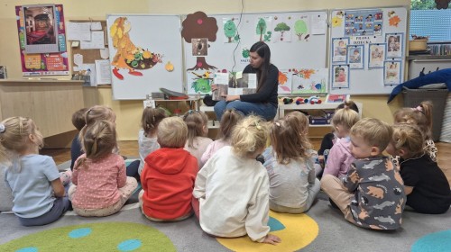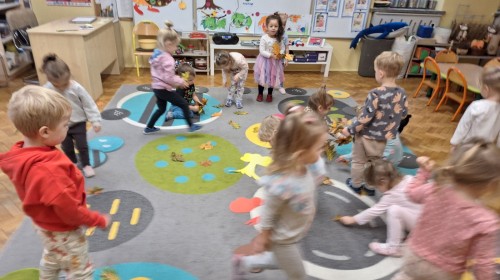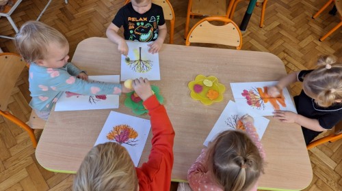 Misie udały się na spacer, dzielnie spacerowały z wężem „Teodorem”, obserwowały przyrodę, zbierały kasztany i dotykały kory drzewa.W tym tygodniu również obchodziliśmy dzień drzewa. Dzieci chętnie słuchały informacji na temat drzew, oglądały książki oraz albumy. Wykonały pracę plastyczną pt. „Jesienne drzewo” – techniką stemplowania. Największą radość sprawiły im zabawy ruchowe przy użyciu chusty animacyjnej, tunelu czy zbieranie liści. Nie zabrakło też działalności matematycznej – przeliczania listków, darów jesieni w zakresie dostępnym dzieciom oraz porównywania zbiorów mniej- więcej.