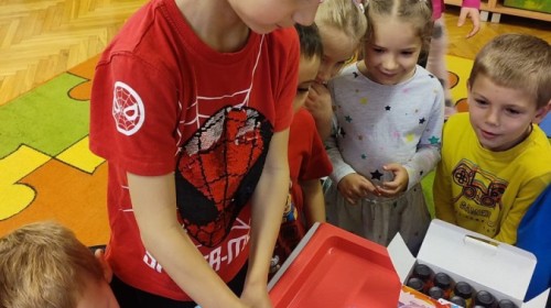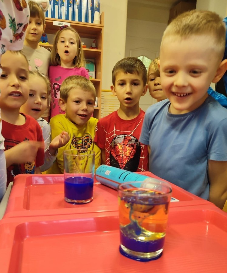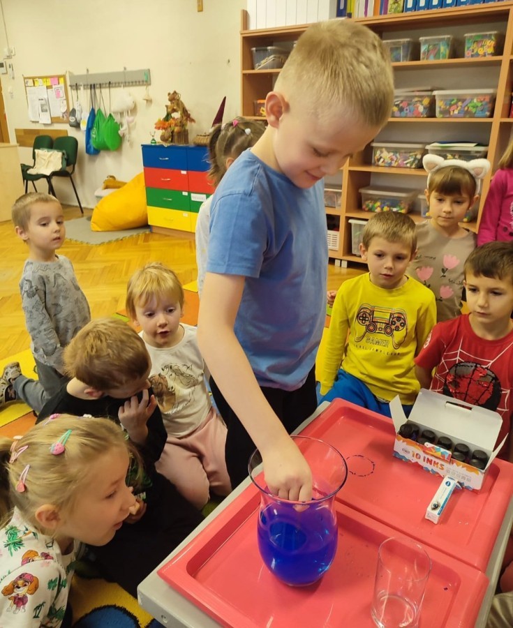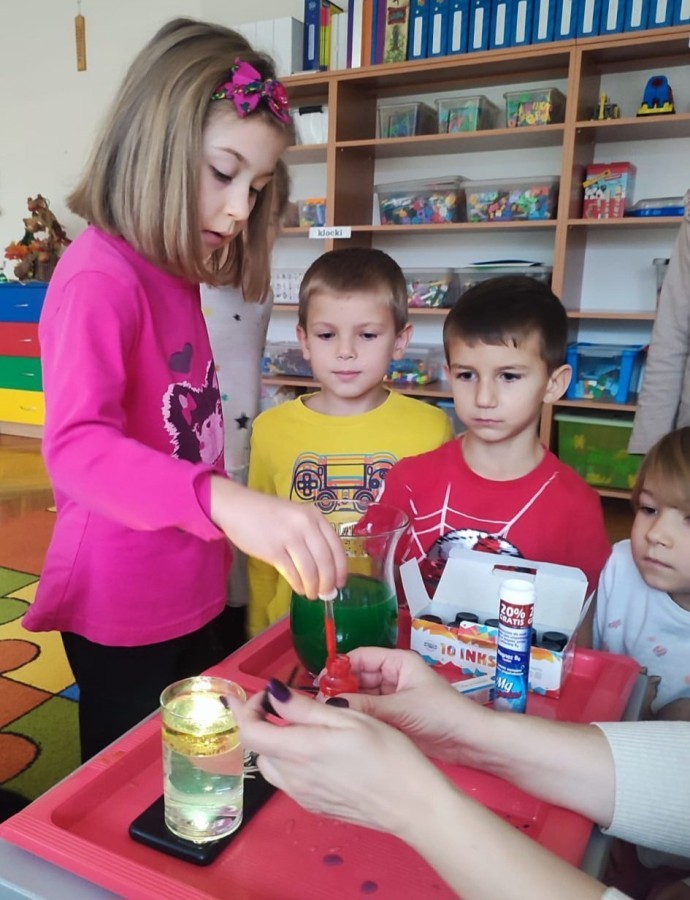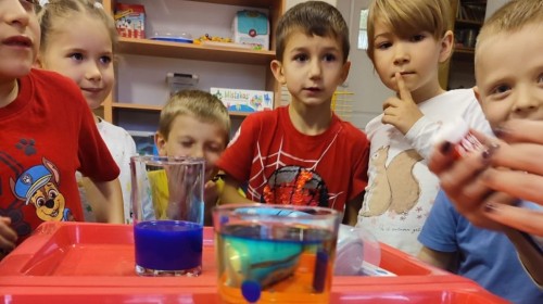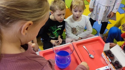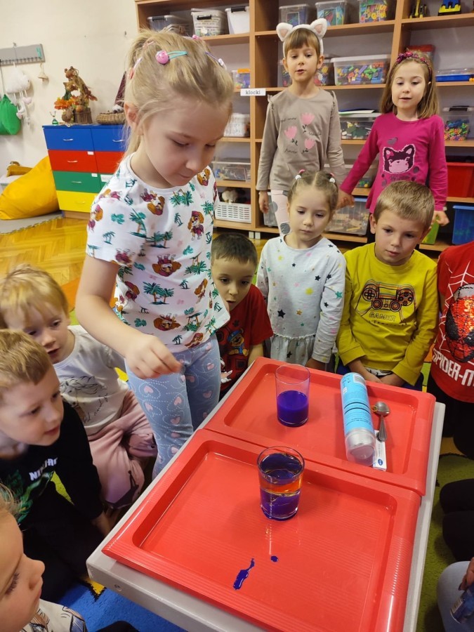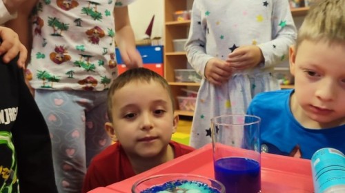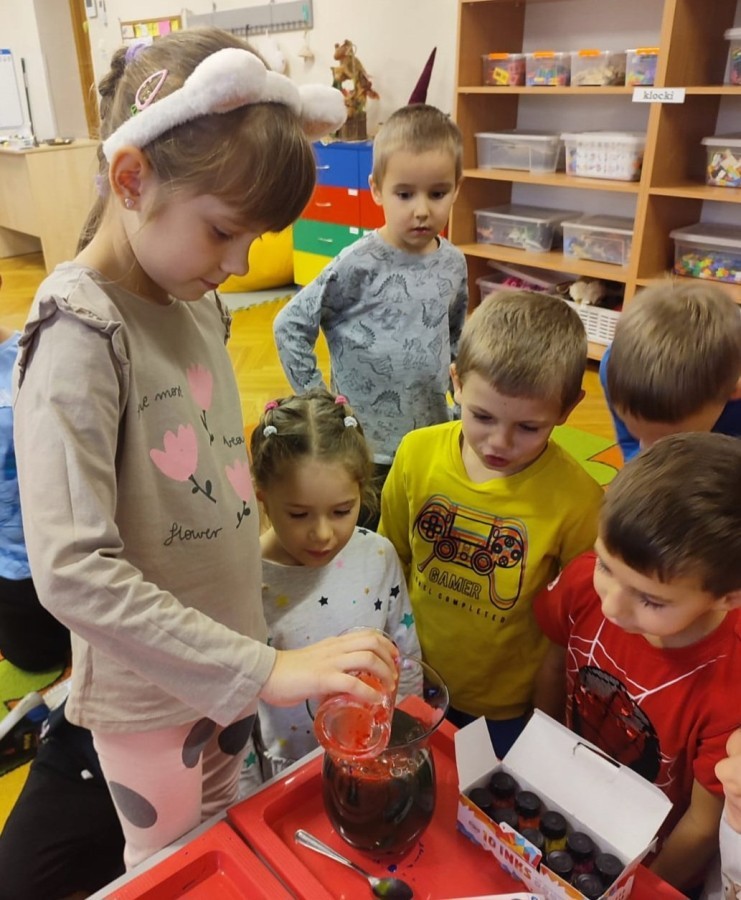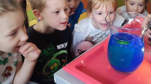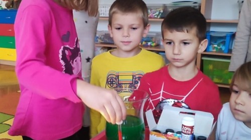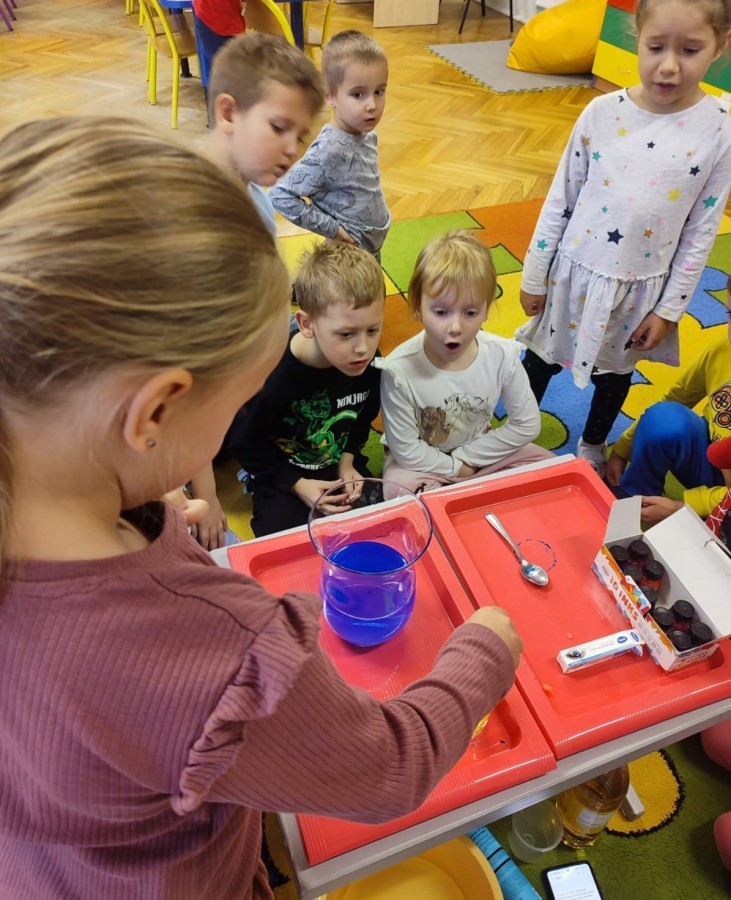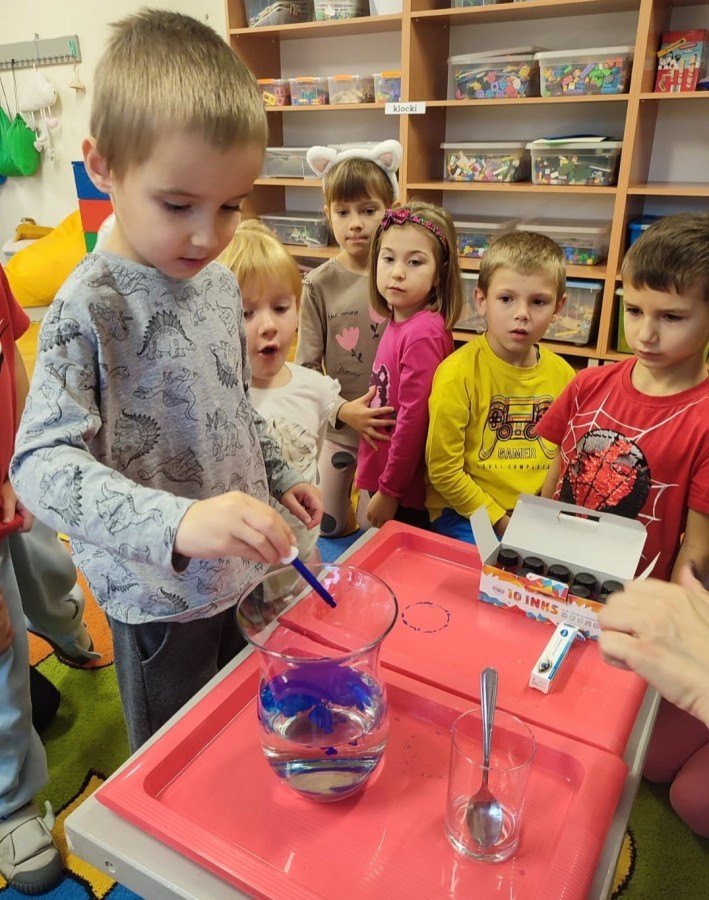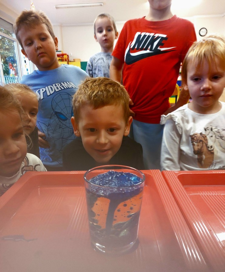 Kasztanki lubią eksperymenty. Bardzo chętnie zatem eksperymentowały z wodą i poznały jej właściwości. Mieszaliśmy kolory, dolewaliśmy olej, zrobiliśmy musującą kolorową wodę i obserwowaliśmy co pływa, a co tonie. Emocjom nie było końca!