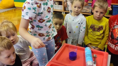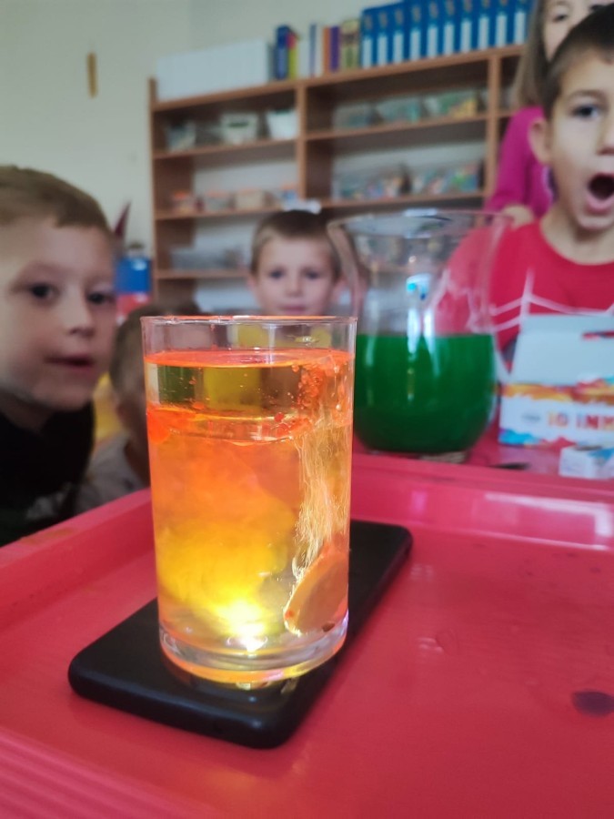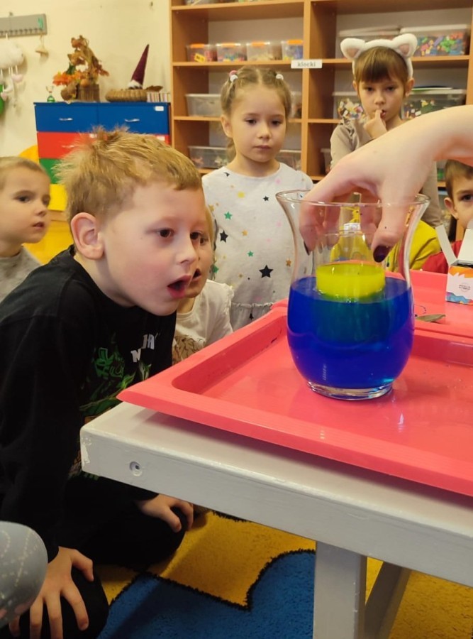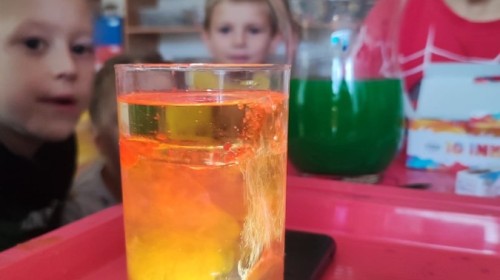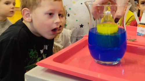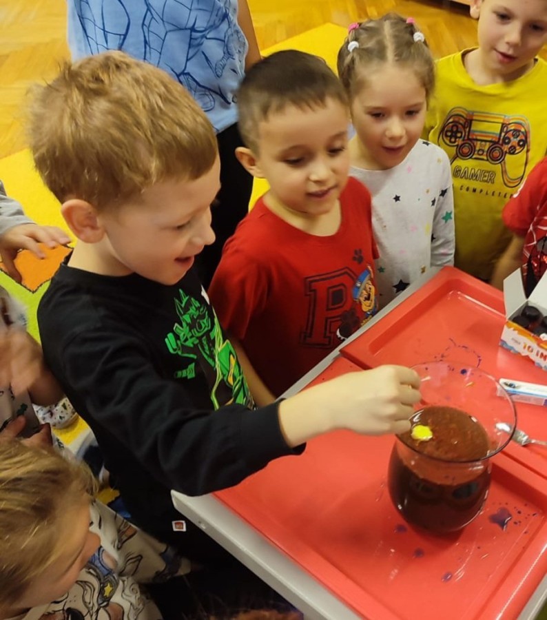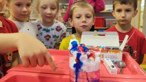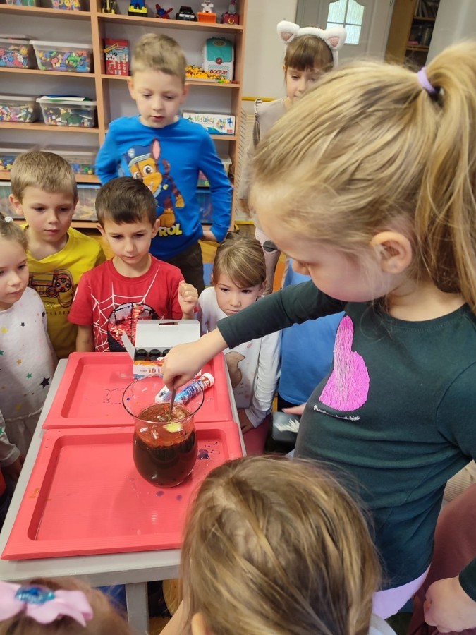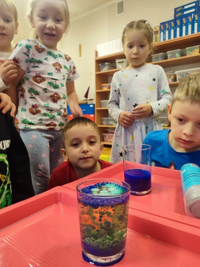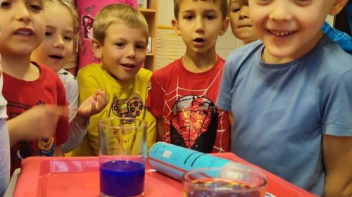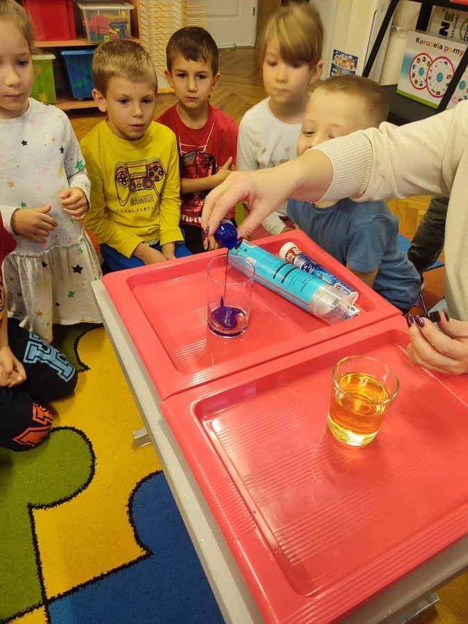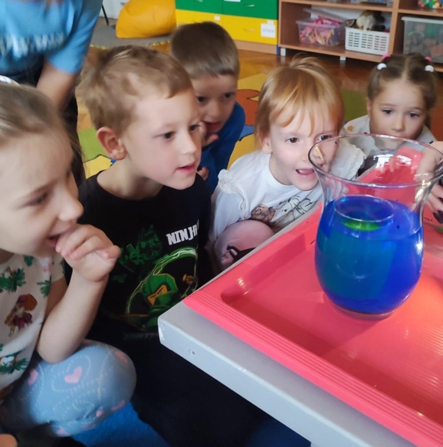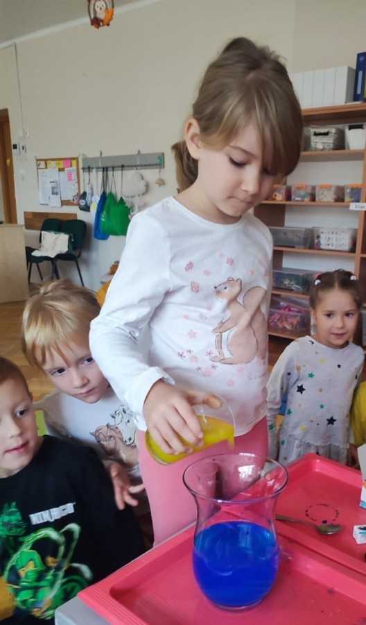 Kasztanki lubią eksperymenty. Bardzo chętnie zatem eksperymentowały z wodą i poznały jej właściwości. Mieszaliśmy kolory, dolewaliśmy olej, zrobiliśmy musującą kolorową wodę i obserwowaliśmy co pływa, a co tonie. Emocjom nie było końca!