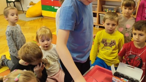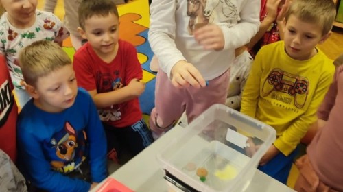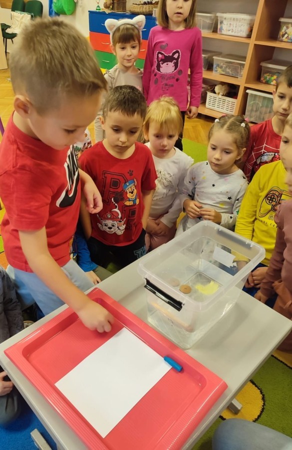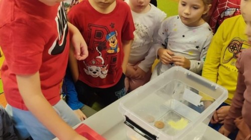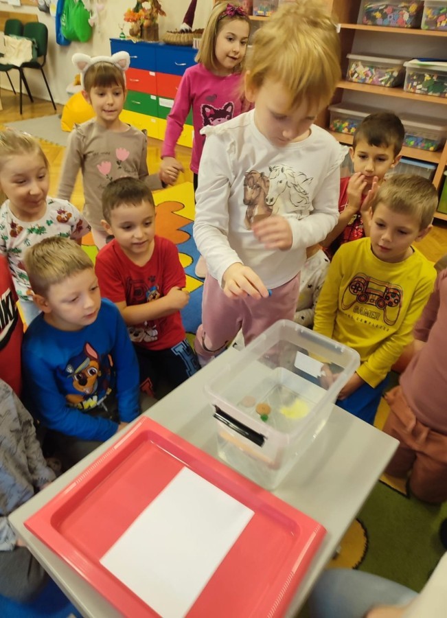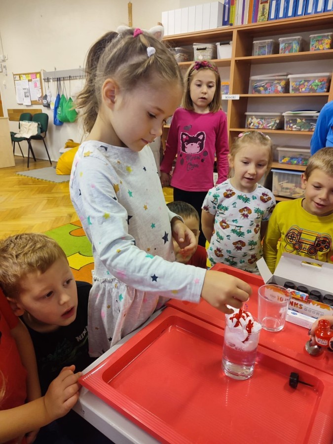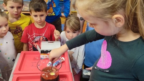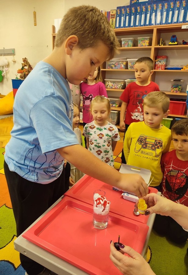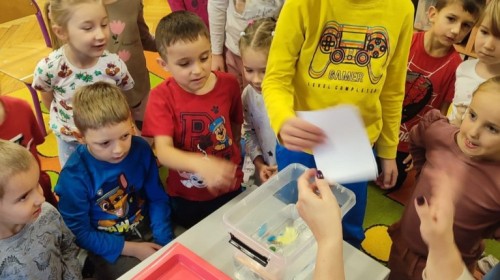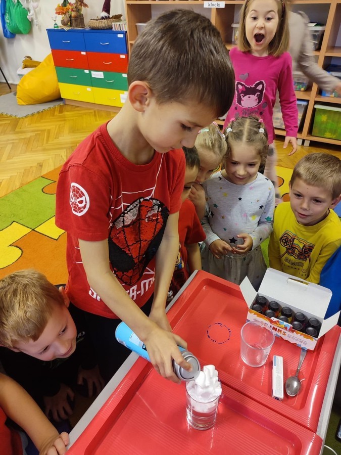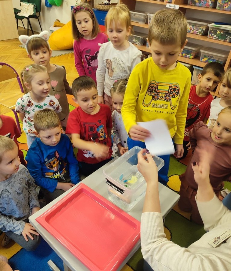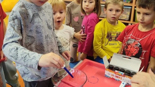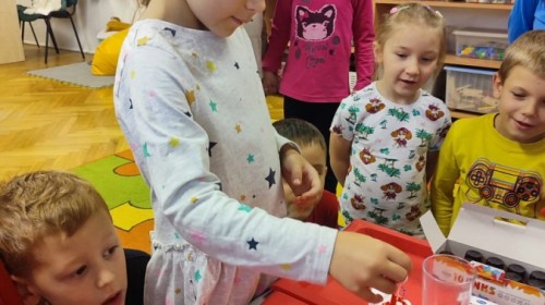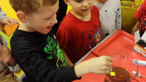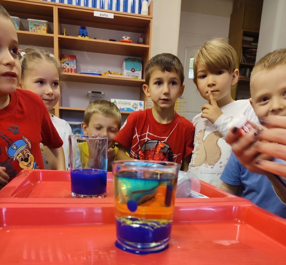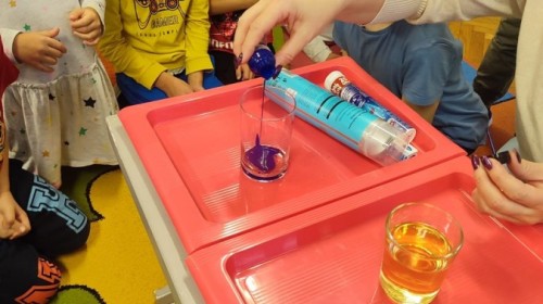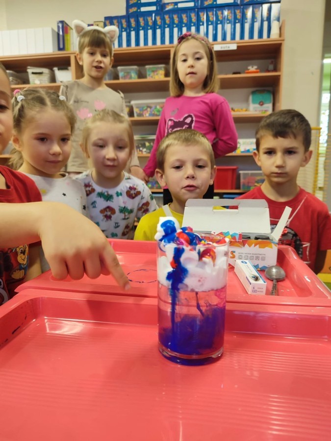 Kasztanki lubią eksperymenty. Bardzo chętnie zatem eksperymentowały z wodą i poznały jej właściwości. Mieszaliśmy kolory, dolewaliśmy olej, zrobiliśmy musującą kolorową wodę i obserwowaliśmy co pływa, a co tonie. Emocjom nie było końca!