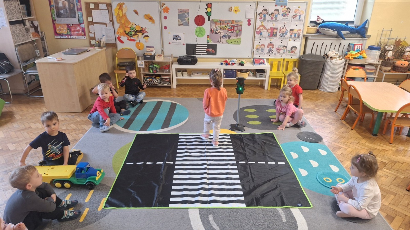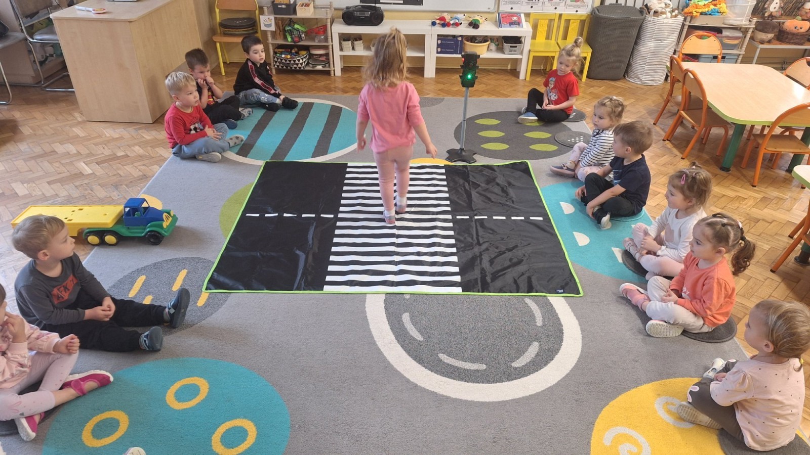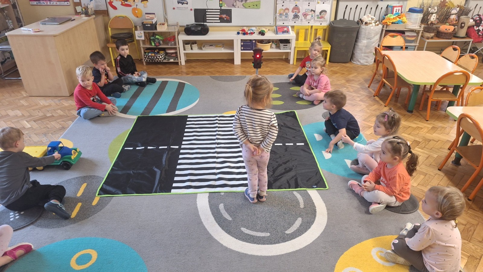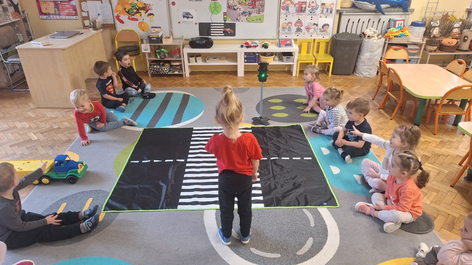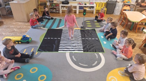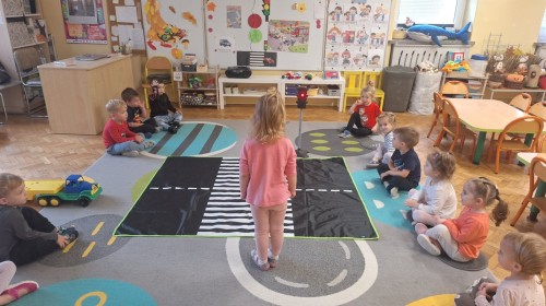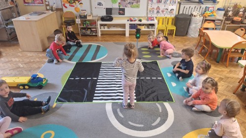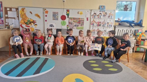 Podczas zajęć dzieci poznawały zasady bezpiecznego poruszania się po drodze. Dowiedziały się, jak prawidłowo przechodzić przez pasy, co oznaczają kolory świateł oraz dlaczego tak ważna jest ostrożność. W ramach zabawy „Różne znaki” dzieci zapoznawały się z kształtami znaków drogowych (koło, kwadrat, trójkąt) i podejmowały próby nazywania figur geometrycznych. Zajęcia odbyły się w radosnej atmosferze, dzięki czemu nauka bezpieczeństwa była pełna zabawy i uśmiechu!