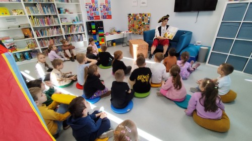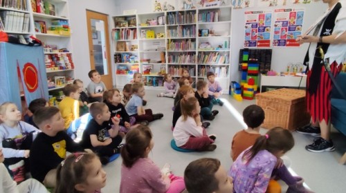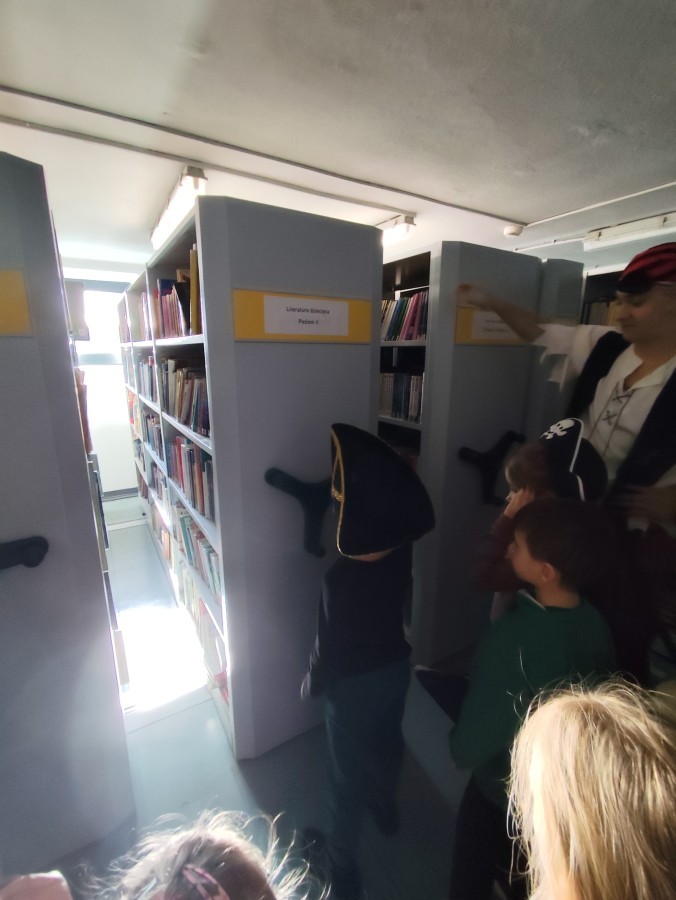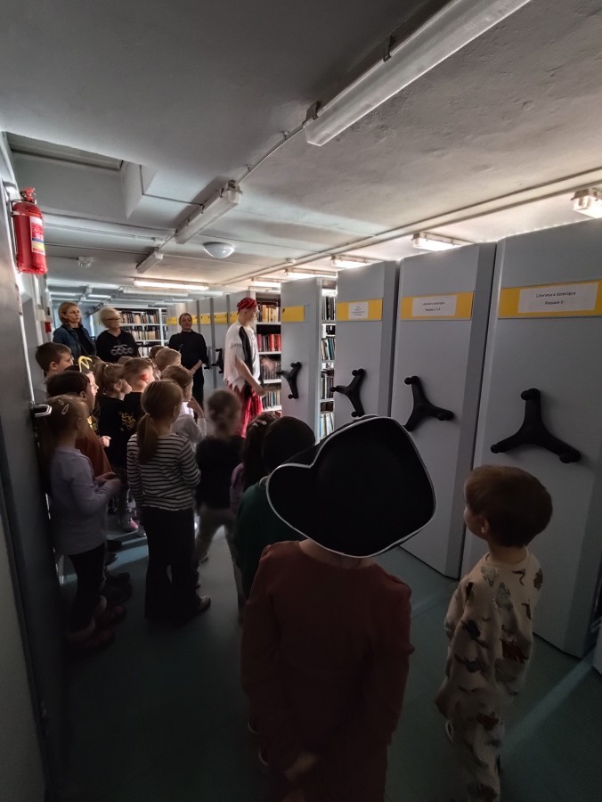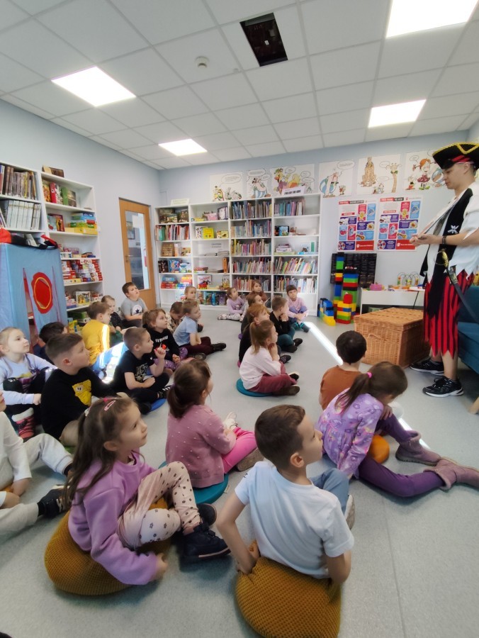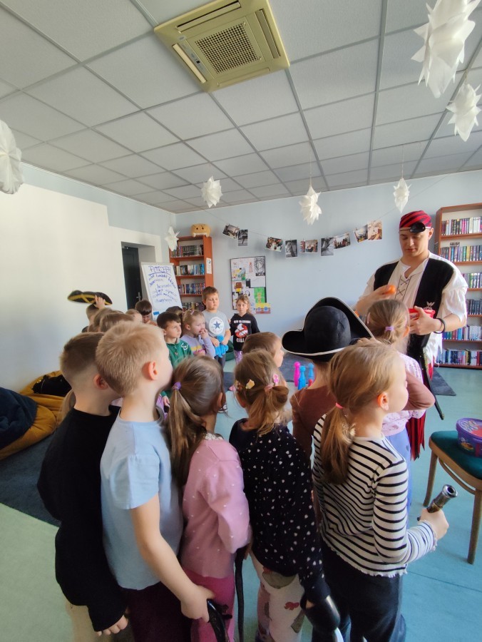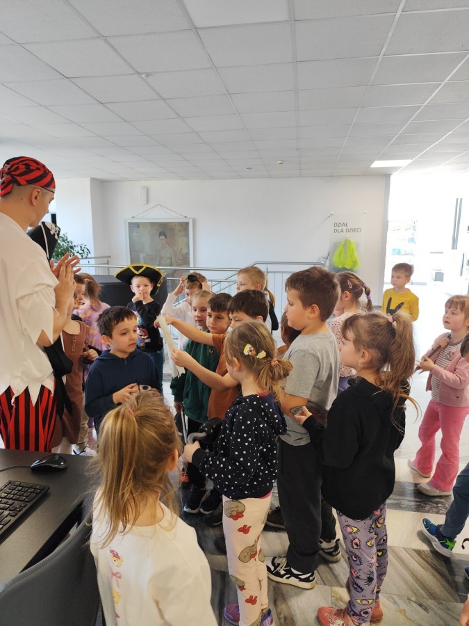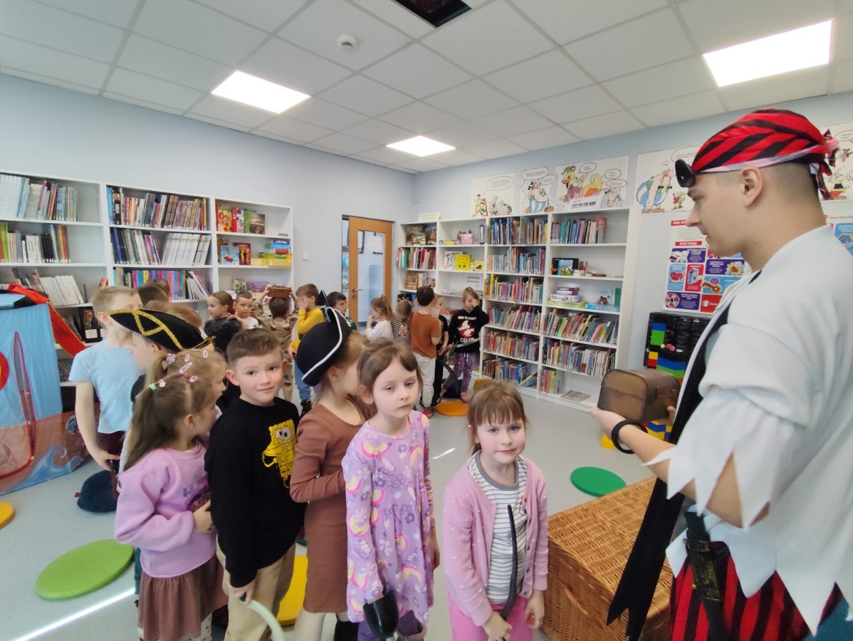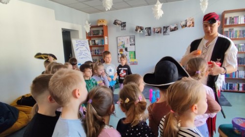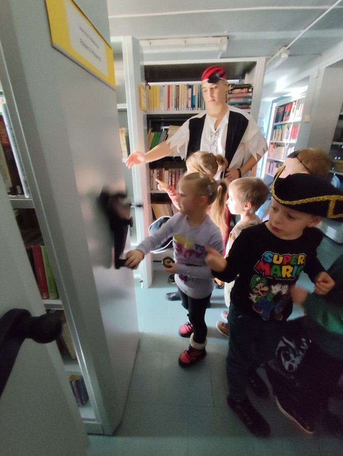 Czytanie książki paragrafowej z całą grupą, rozdanie pirackich rekwizytów, podział ról w załodze i podróż po Książnicy Beskidzkiej w poszukiwaniu skarbów..