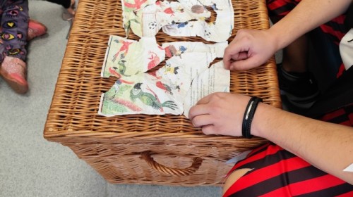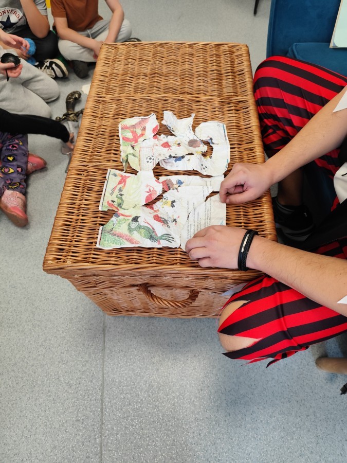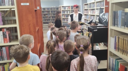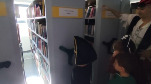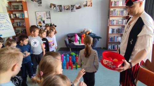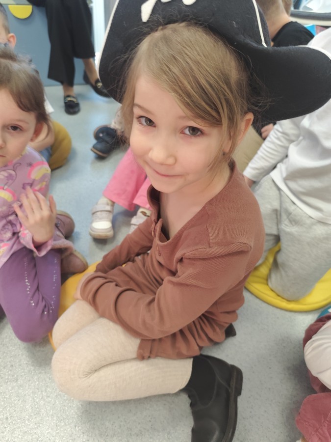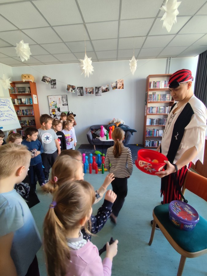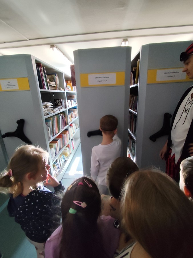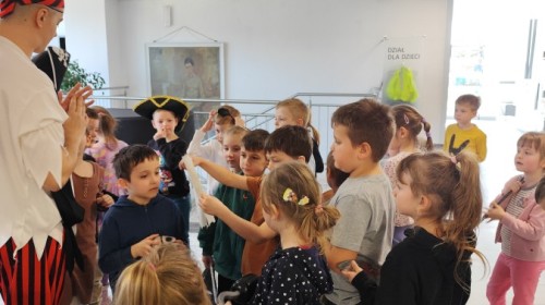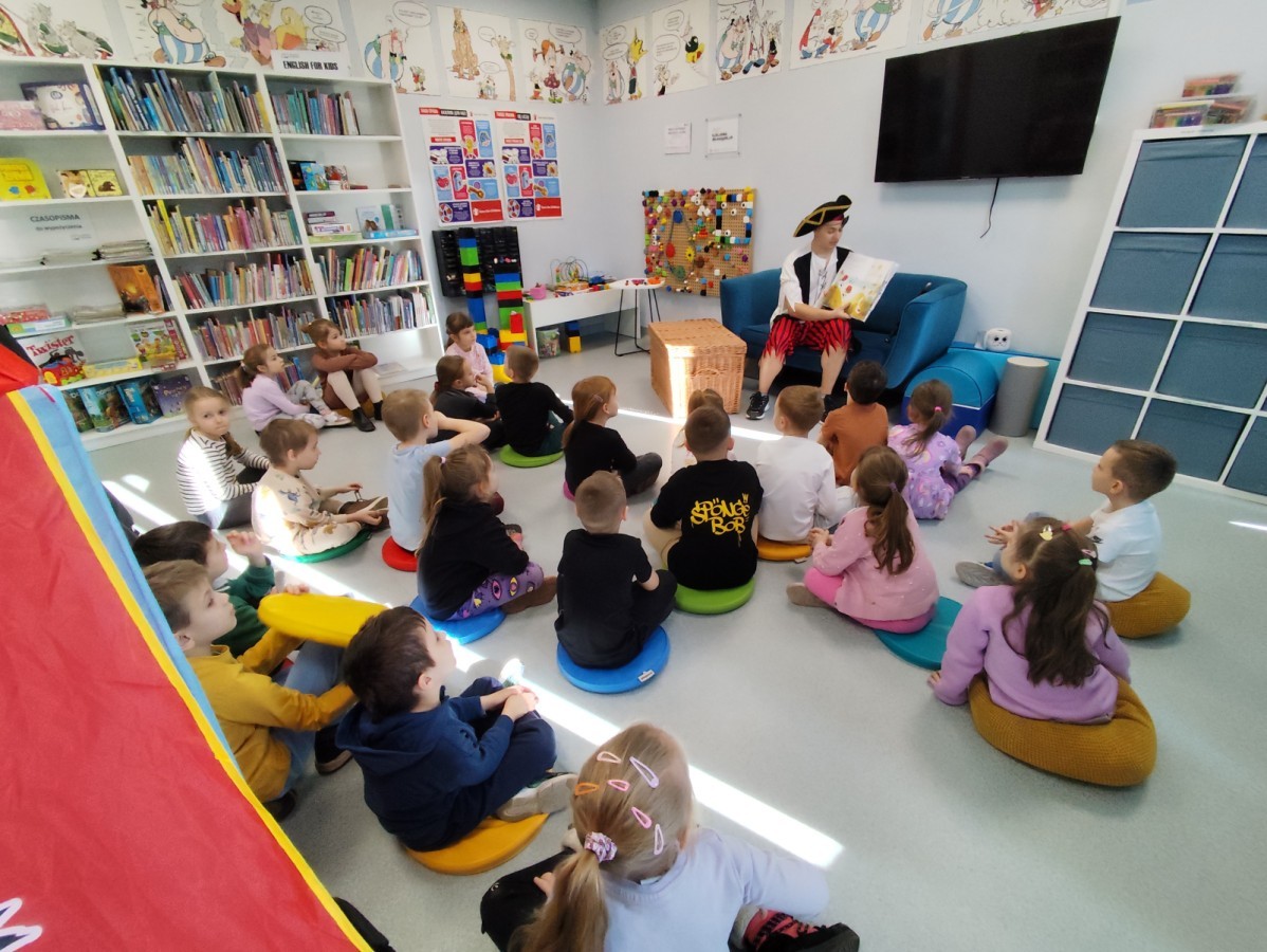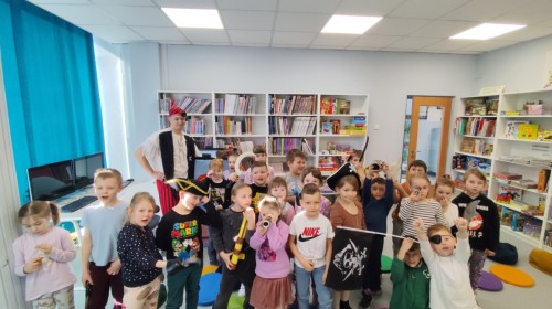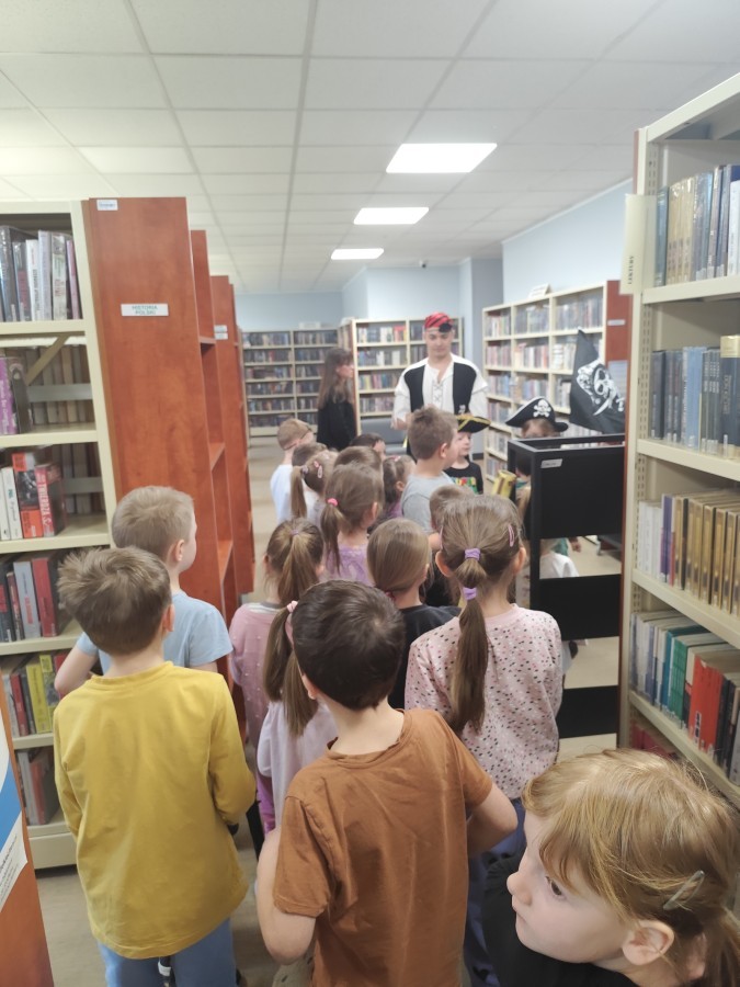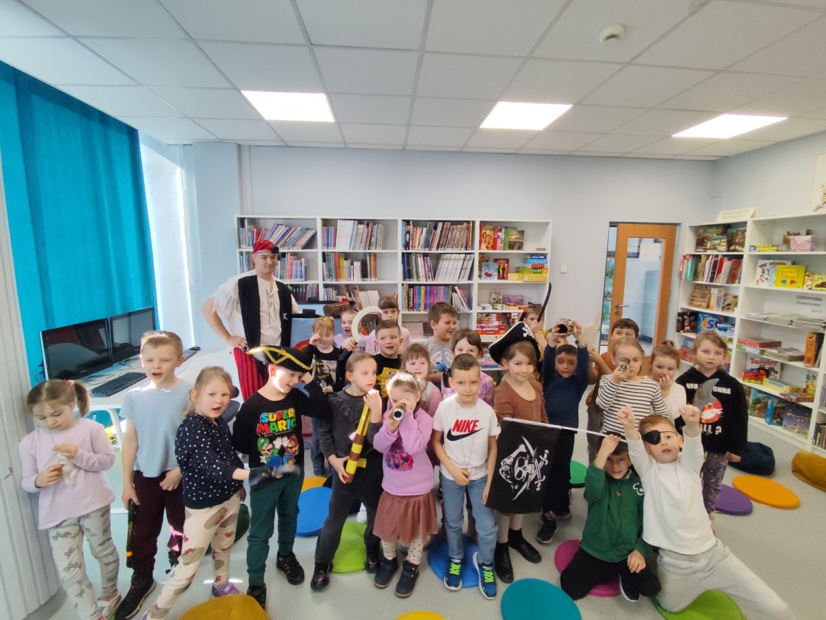 Czytanie książki paragrafowej z całą grupą, rozdanie pirackich rekwizytów, podział ról w załodze i podróż po Książnicy Beskidzkiej w poszukiwaniu skarbów..