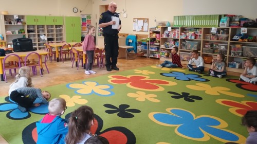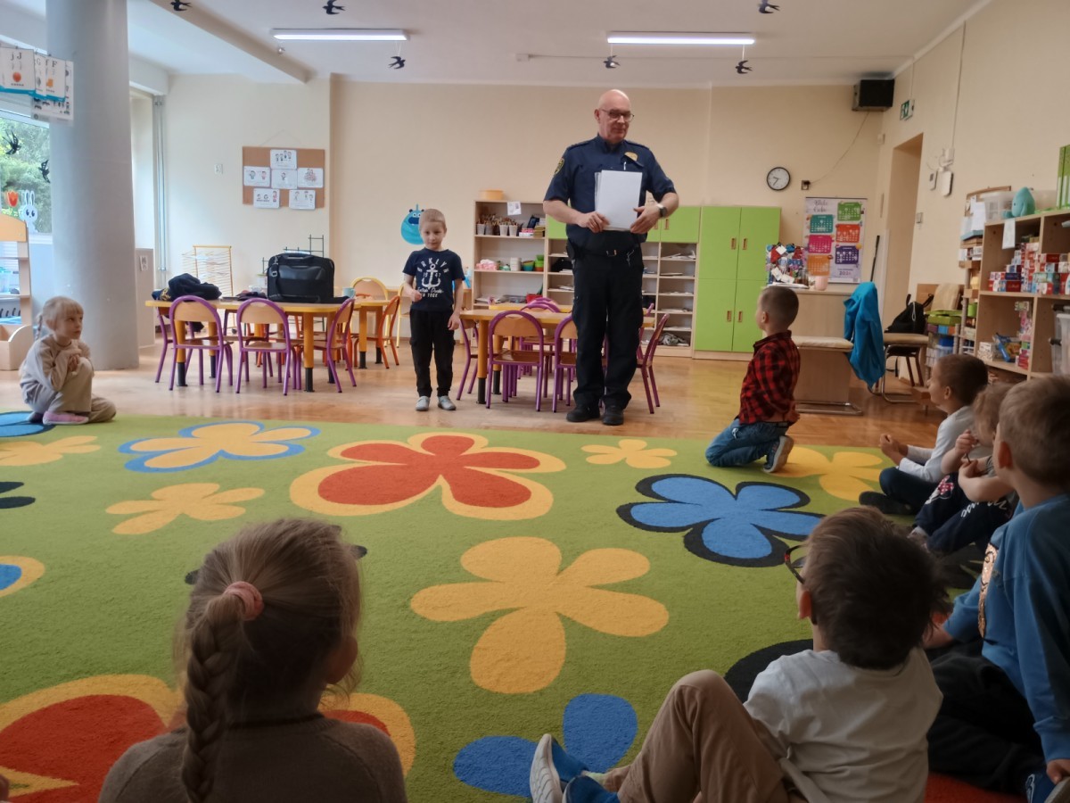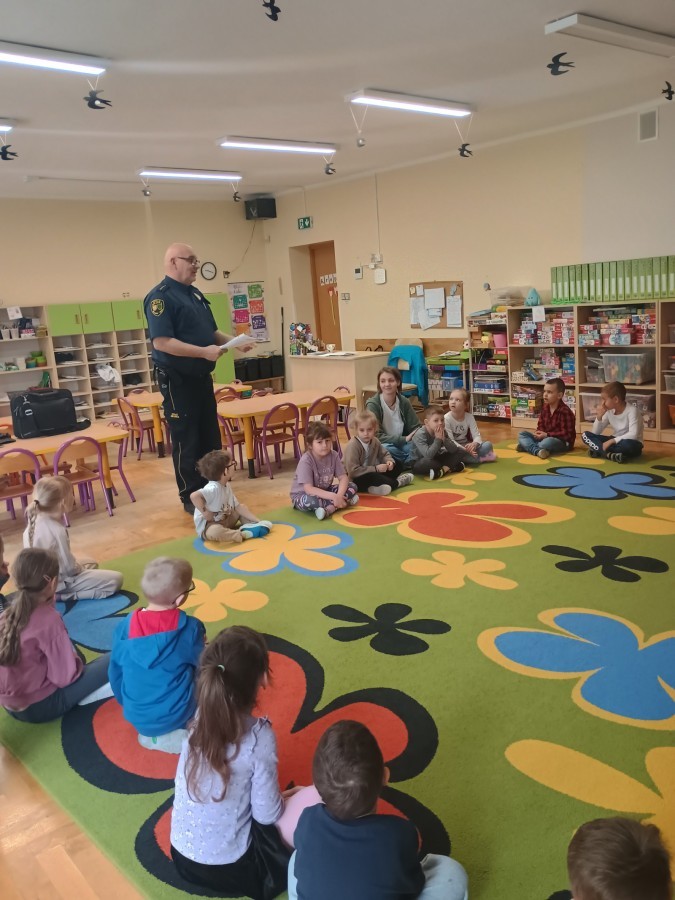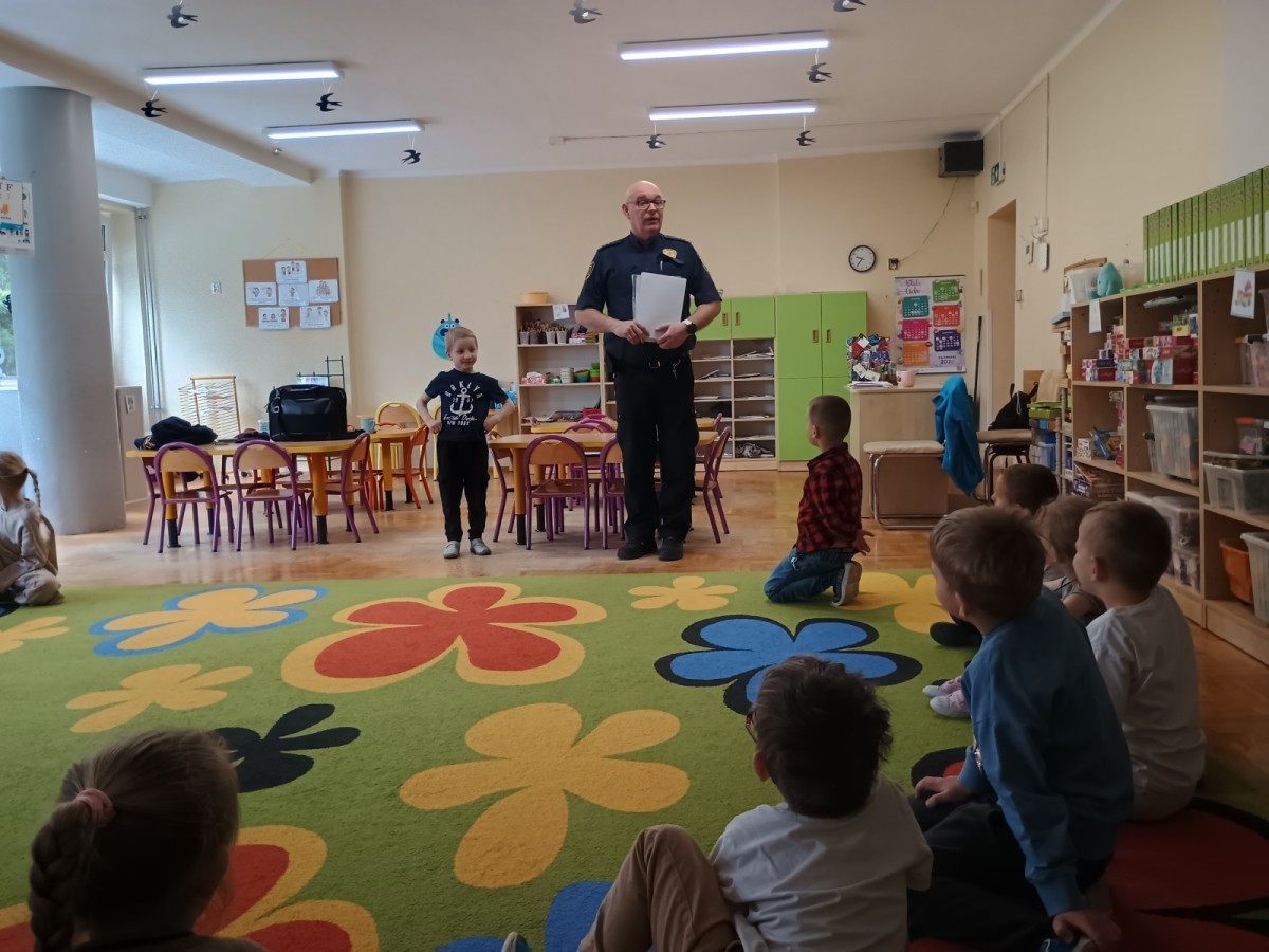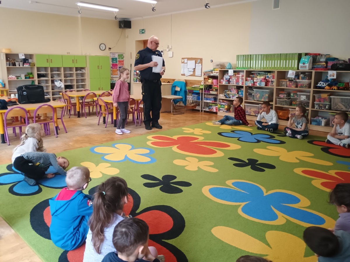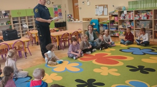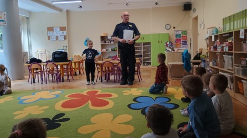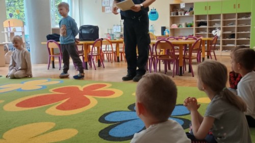 Dzisiaj po raz kolejny odwiedził nas Pan Mirosław, tym razem przypomnieliśmy sobie zasady związane z zachowaniem podczas "spotkań z nieznajomym". Kropelki wykazały się dużą wiedzą i chętnie odgrywały scenki.