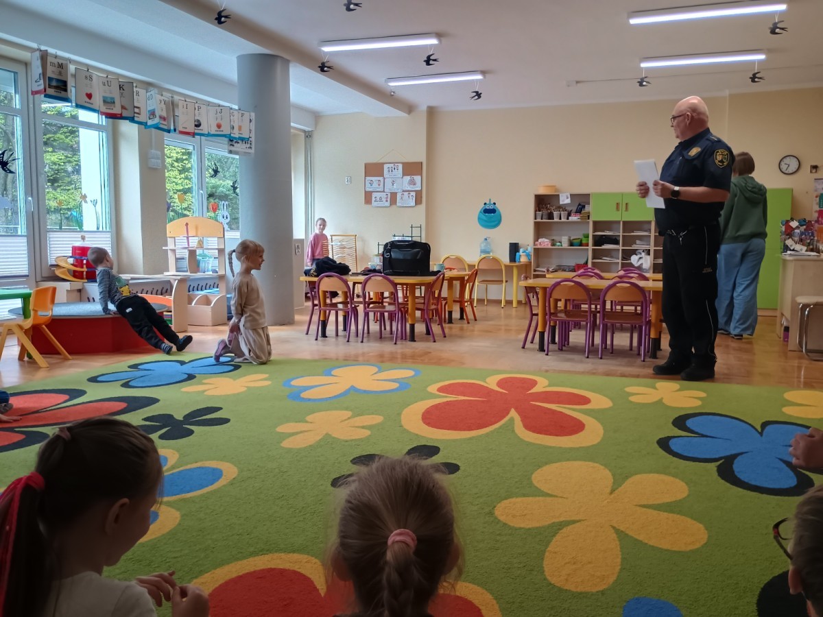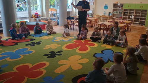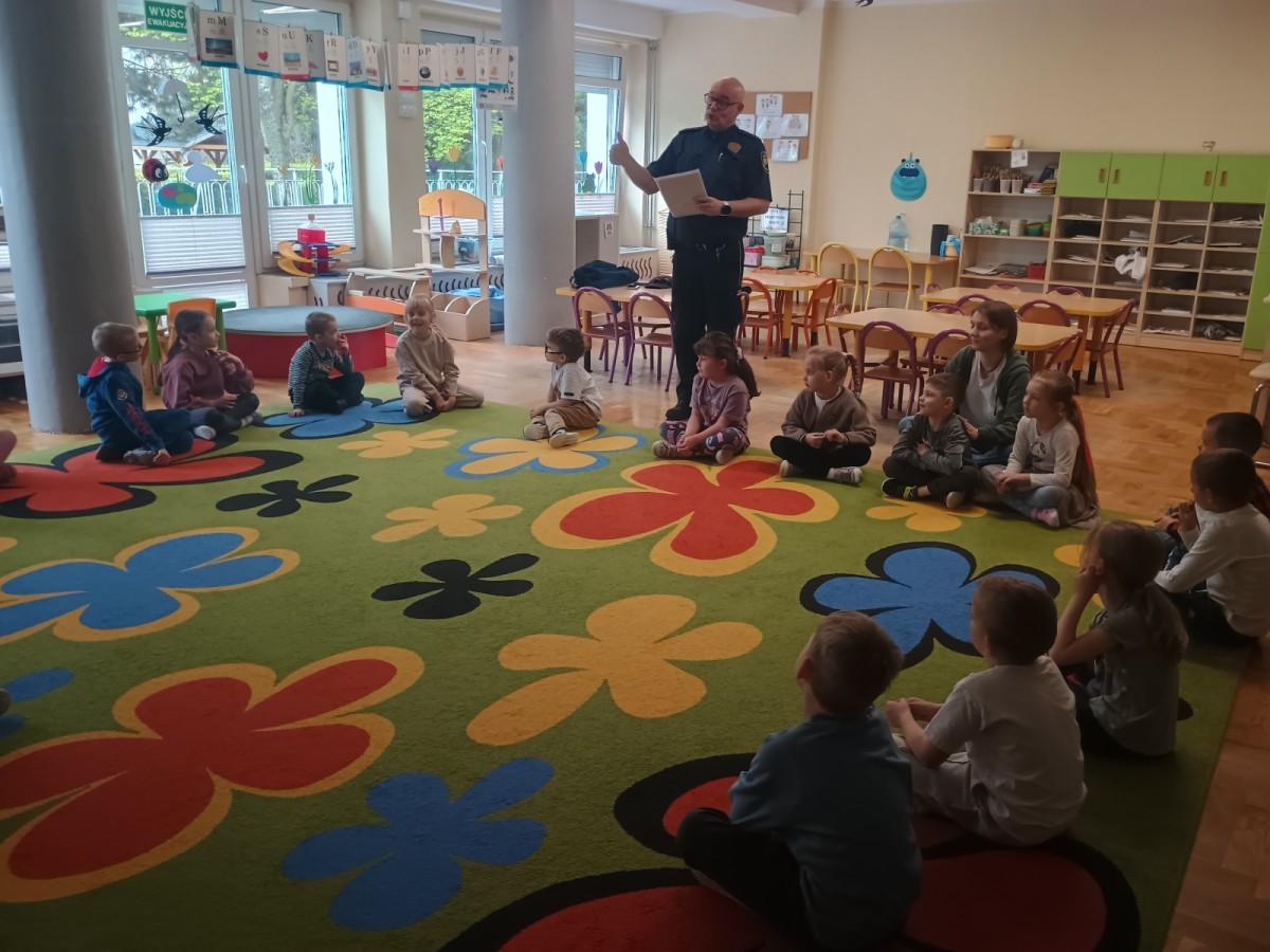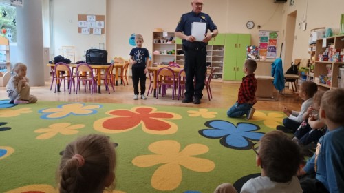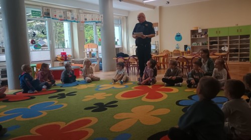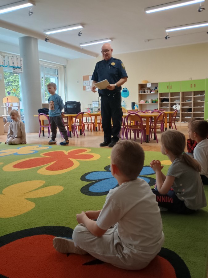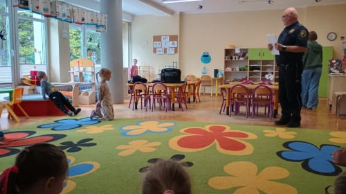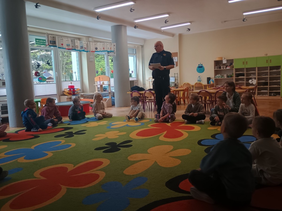 Dzisiaj po raz kolejny odwiedził nas Pan Mirosław, tym razem przypomnieliśmy sobie zasady związane z zachowaniem podczas "spotkań z nieznajomym". Kropelki wykazały się dużą wiedzą i chętnie odgrywały scenki.