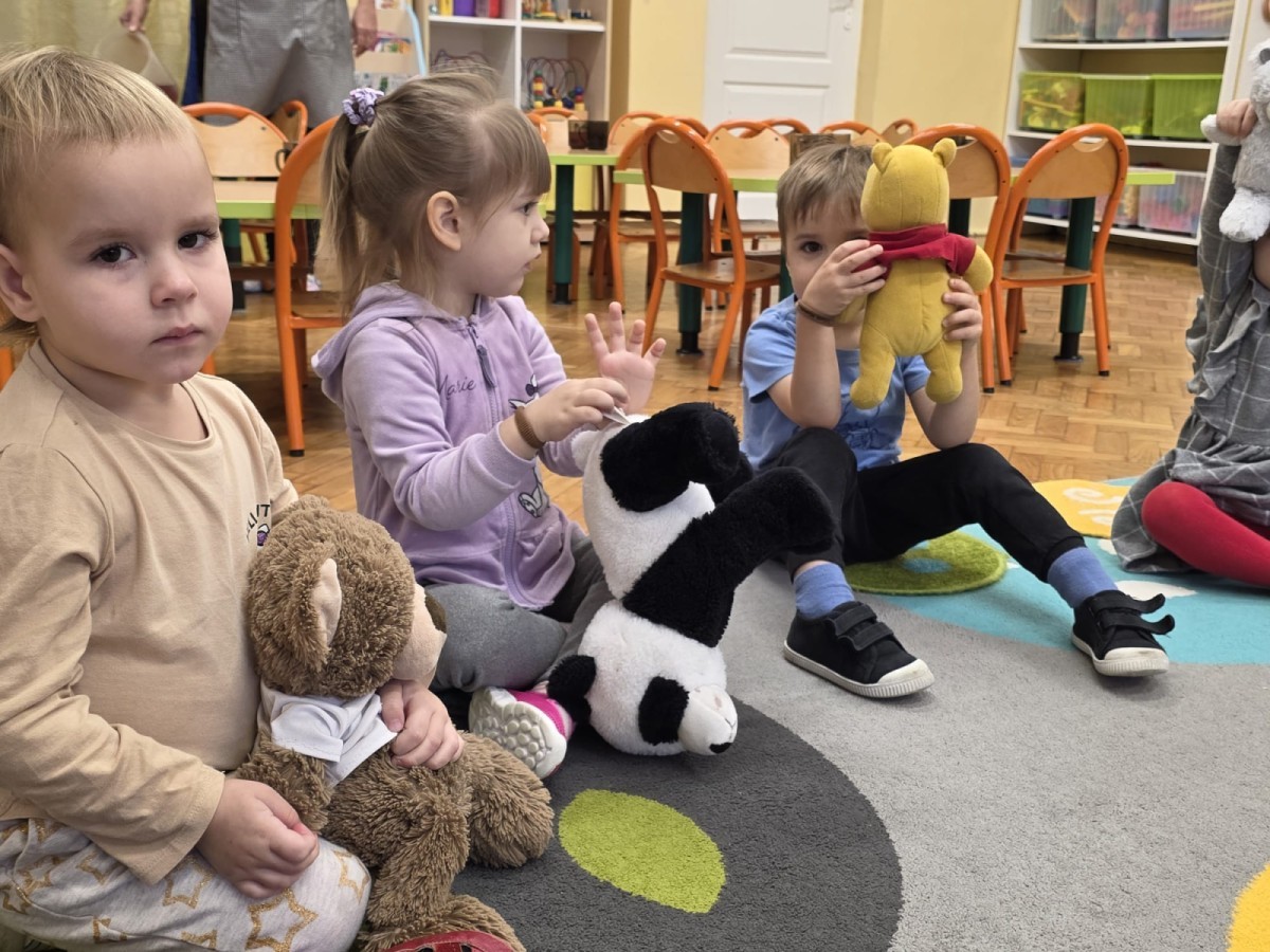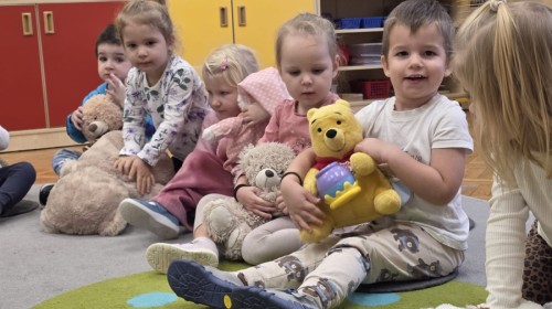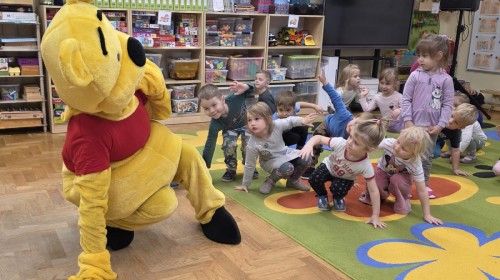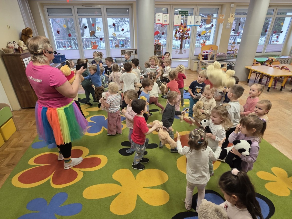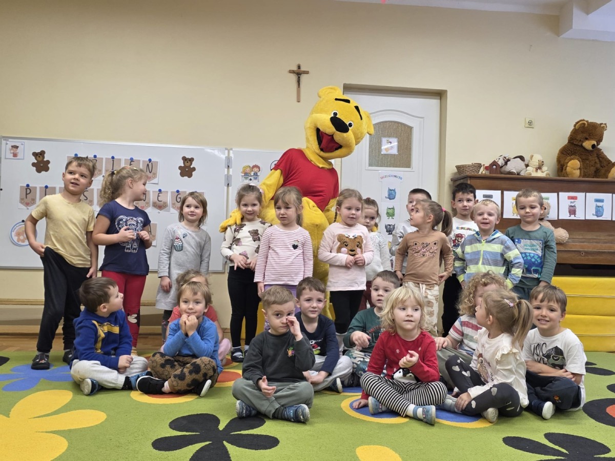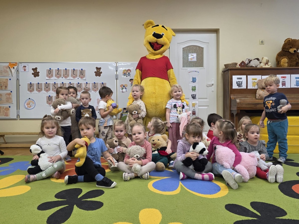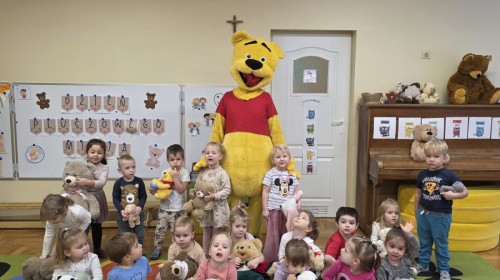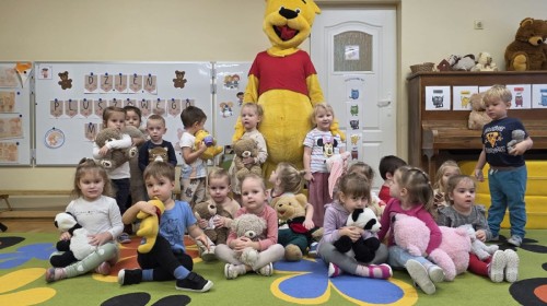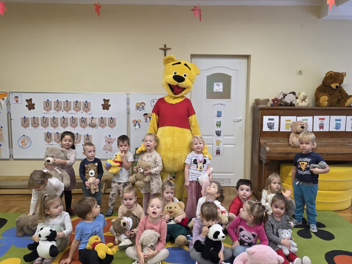 Dzieci z grupy Misie zaprezentowały swoje Misie, odgadywały i określały "Gdzie jest miś", grały w "Misiowe memorki". Potem wspólnie z grupą Biedronek bawiły się z Animatorkami, spotkały Kubusia Puchatka bawiły się, przytulały do Misia i zrobiliśmy wspólne zdjęcie.