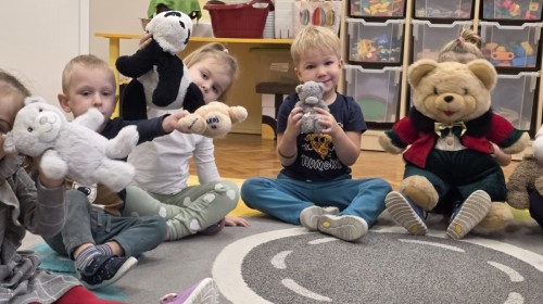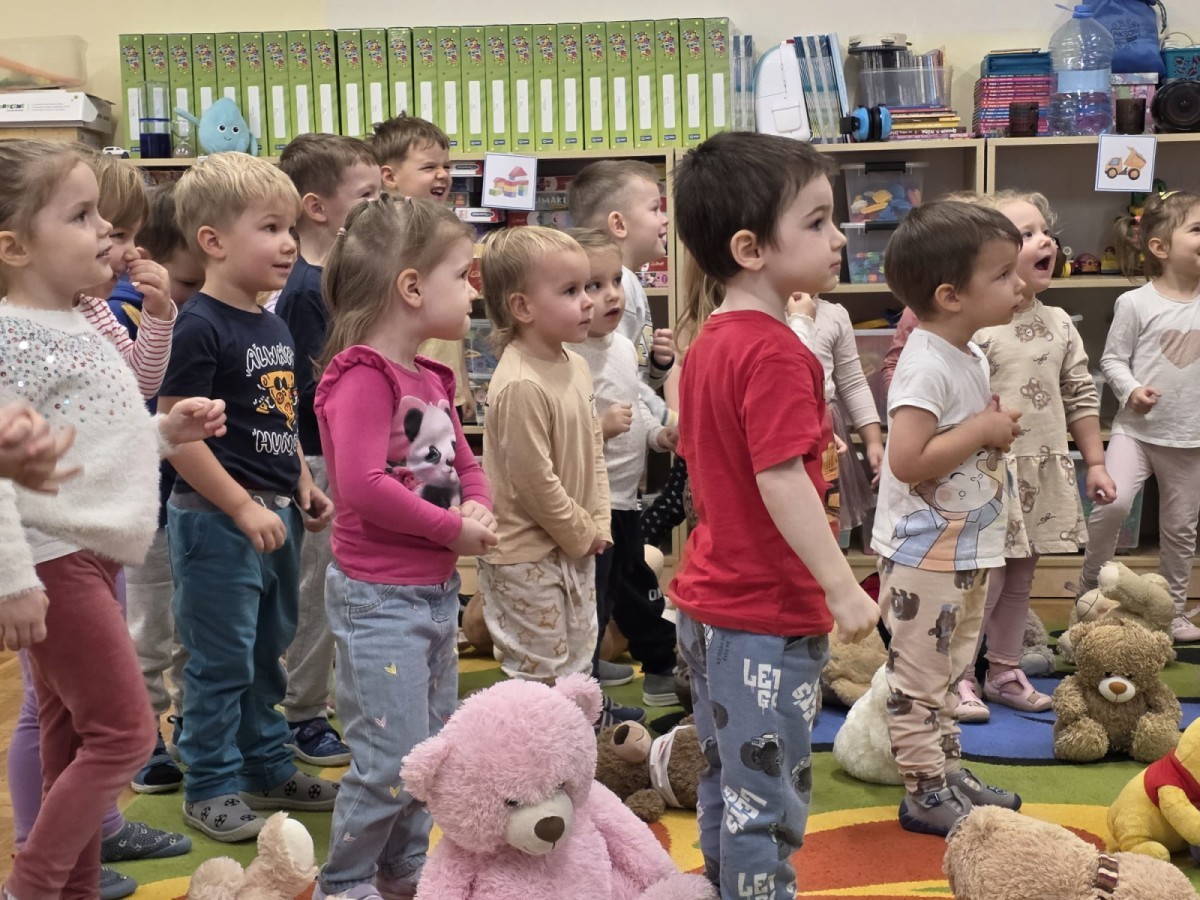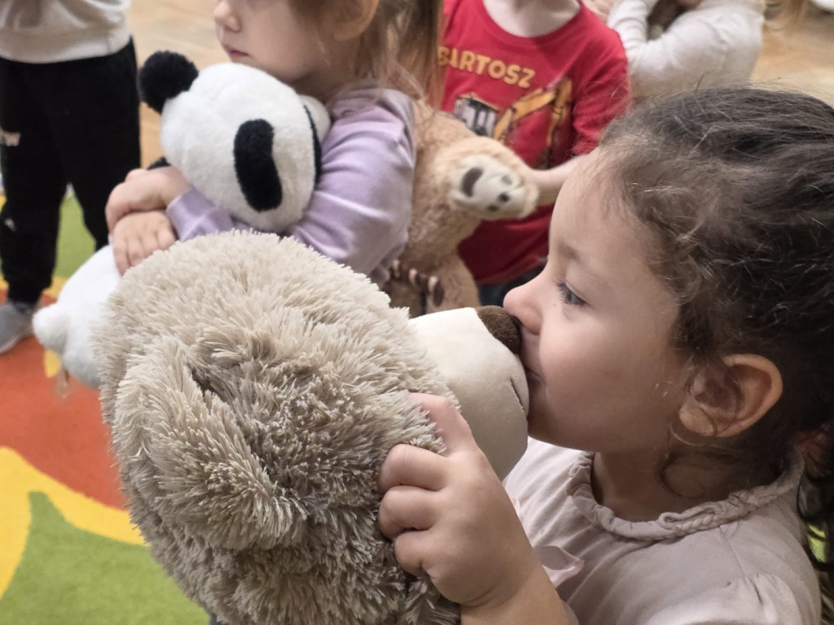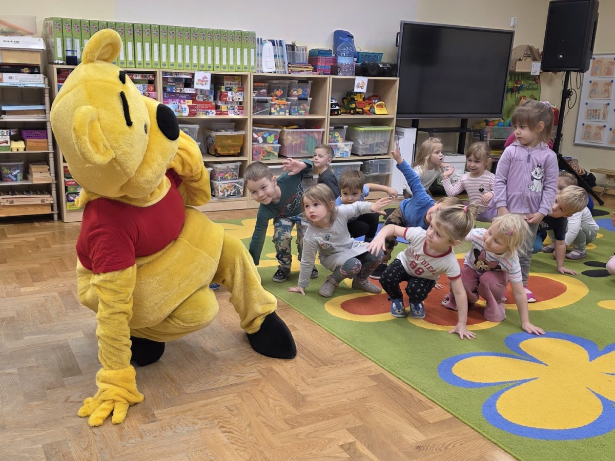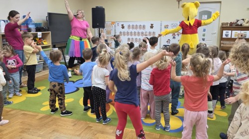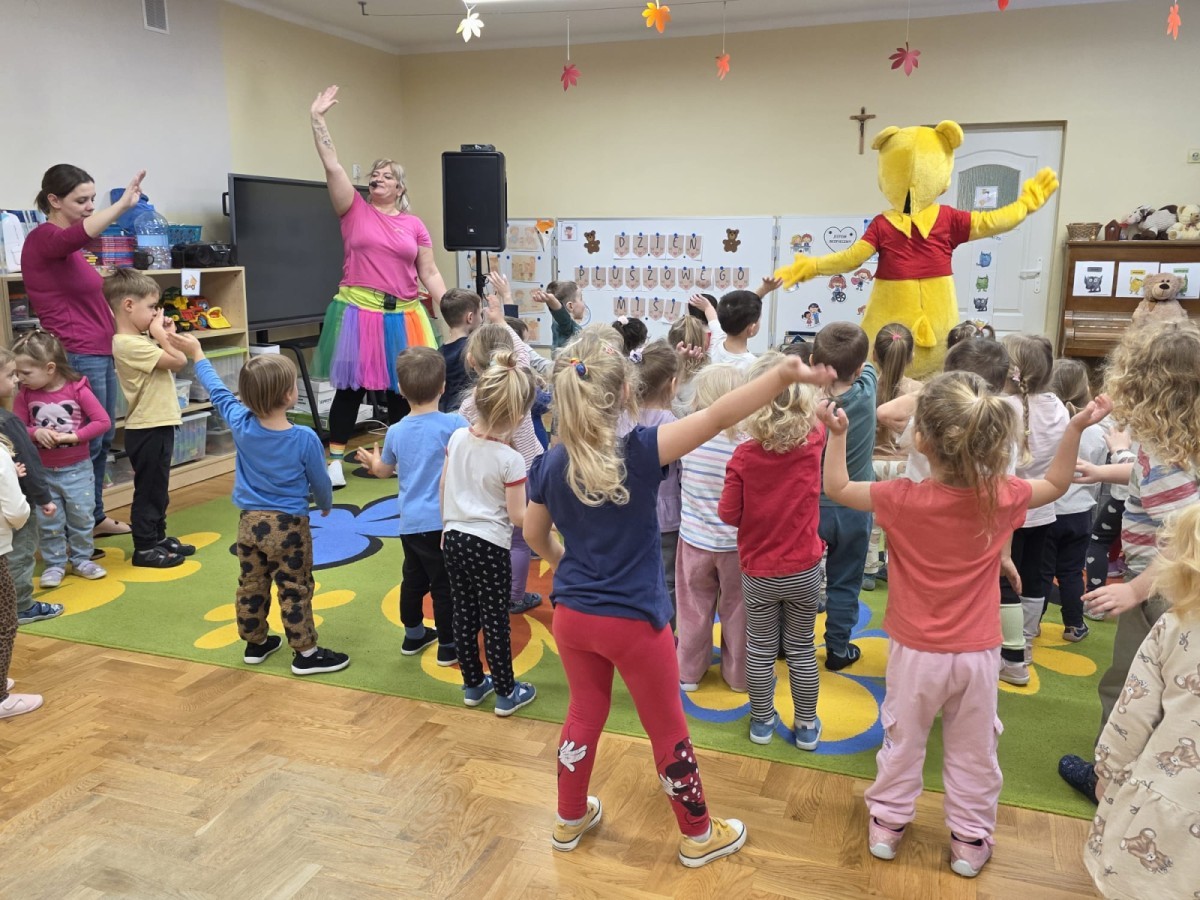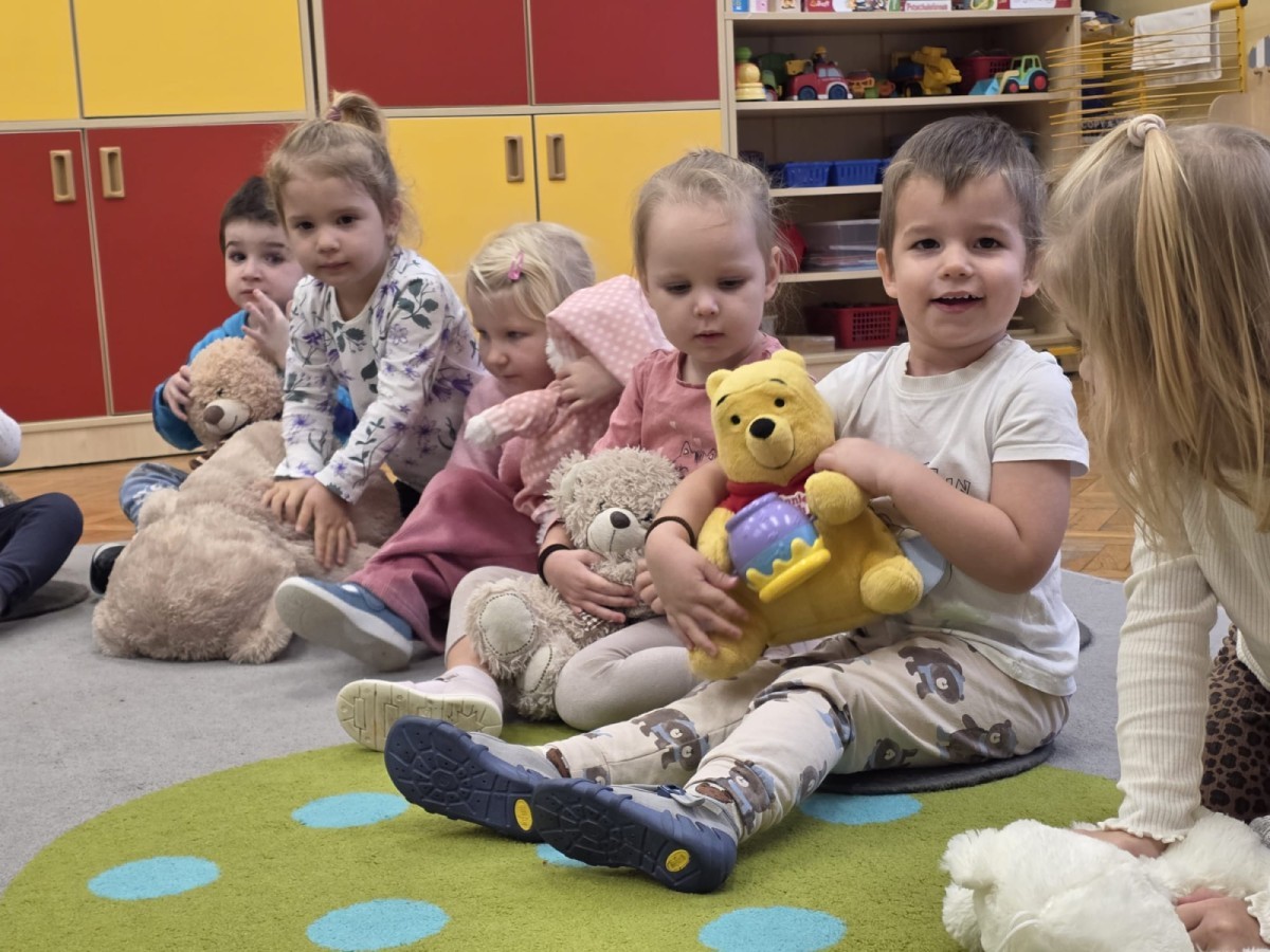 Dzieci z grupy Misie zaprezentowały swoje Misie, odgadywały i określały "Gdzie jest miś", grały w "Misiowe memorki". Potem wspólnie z grupą Biedronek bawiły się z Animatorkami, spotkały Kubusia Puchatka bawiły się, przytulały do Misia i zrobiliśmy wspólne zdjęcie.