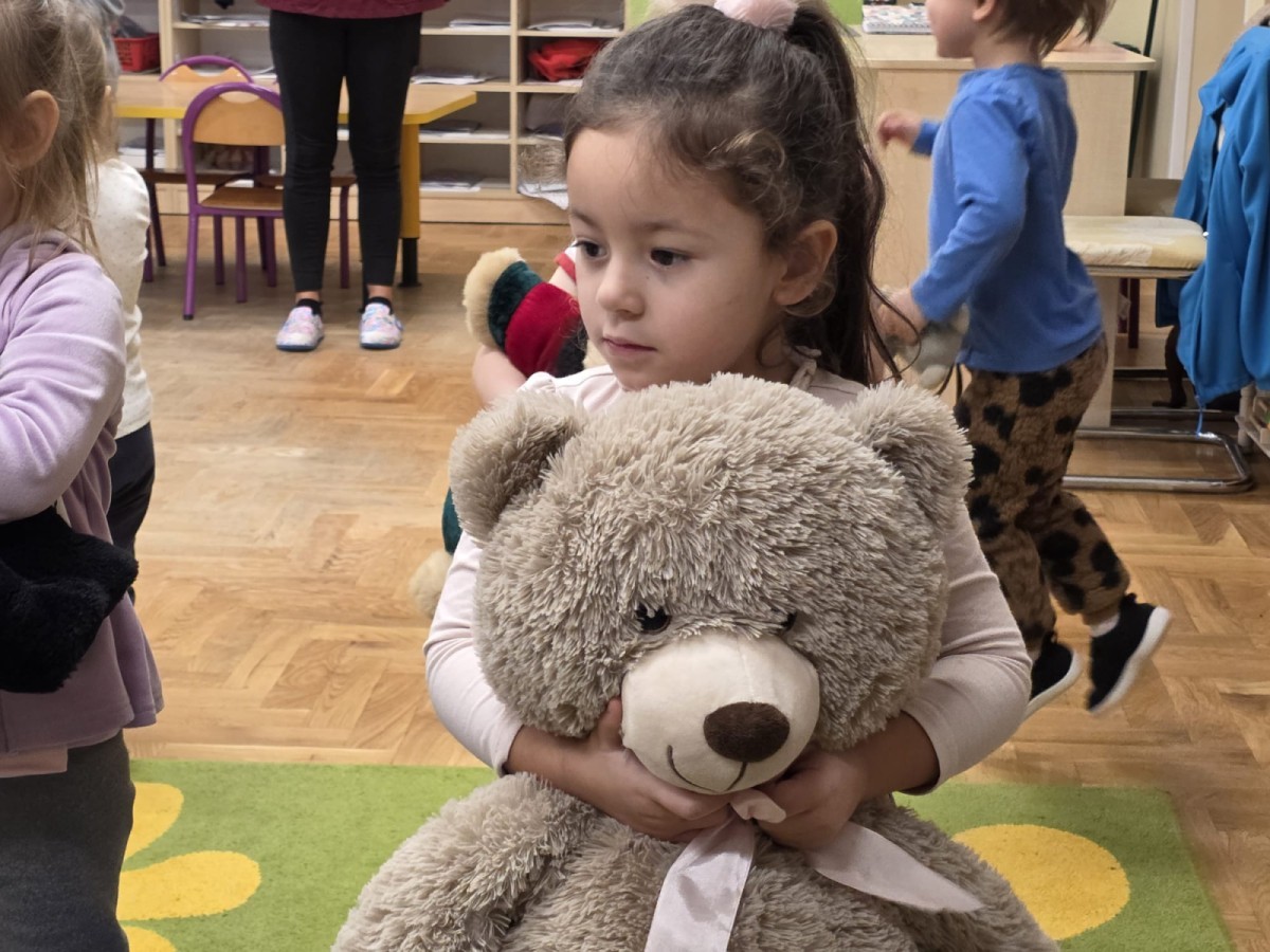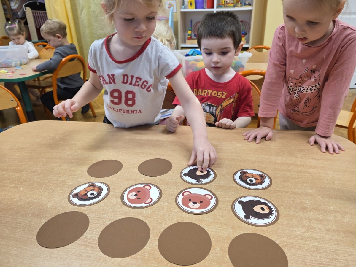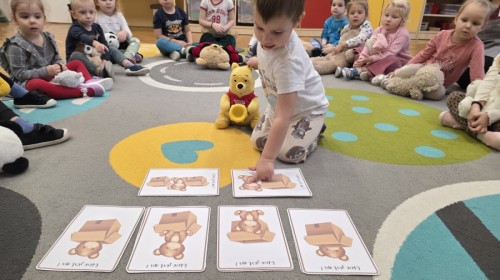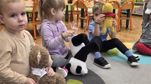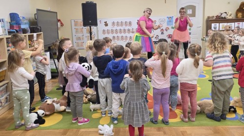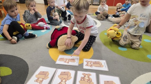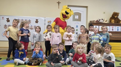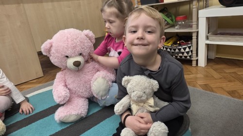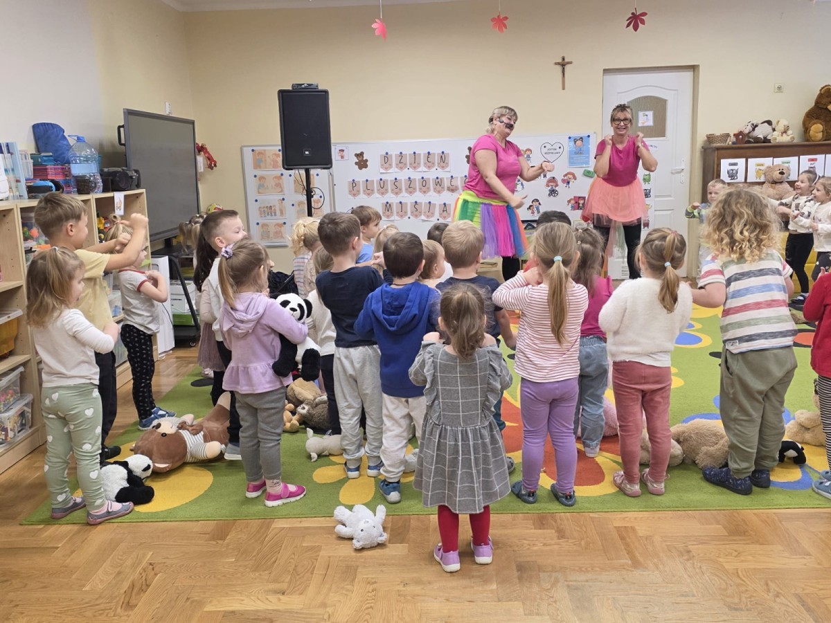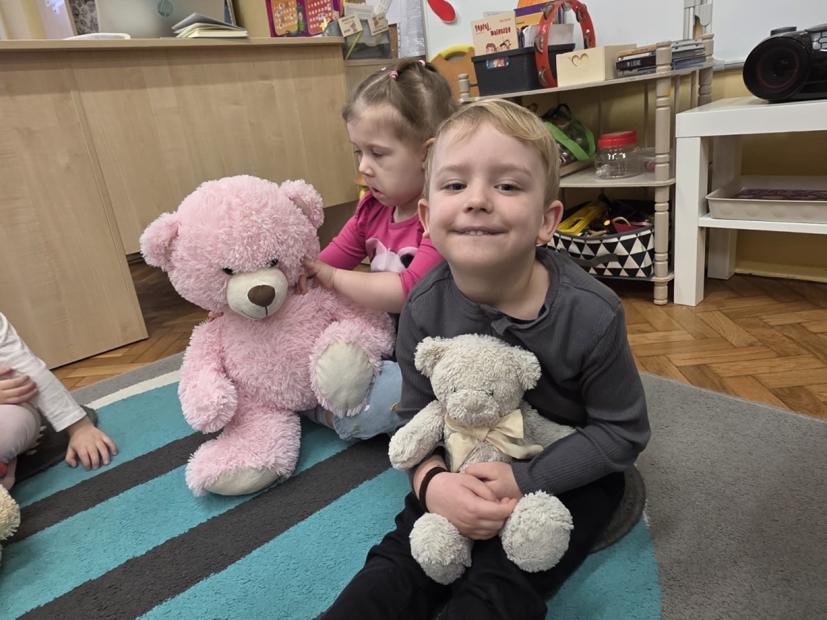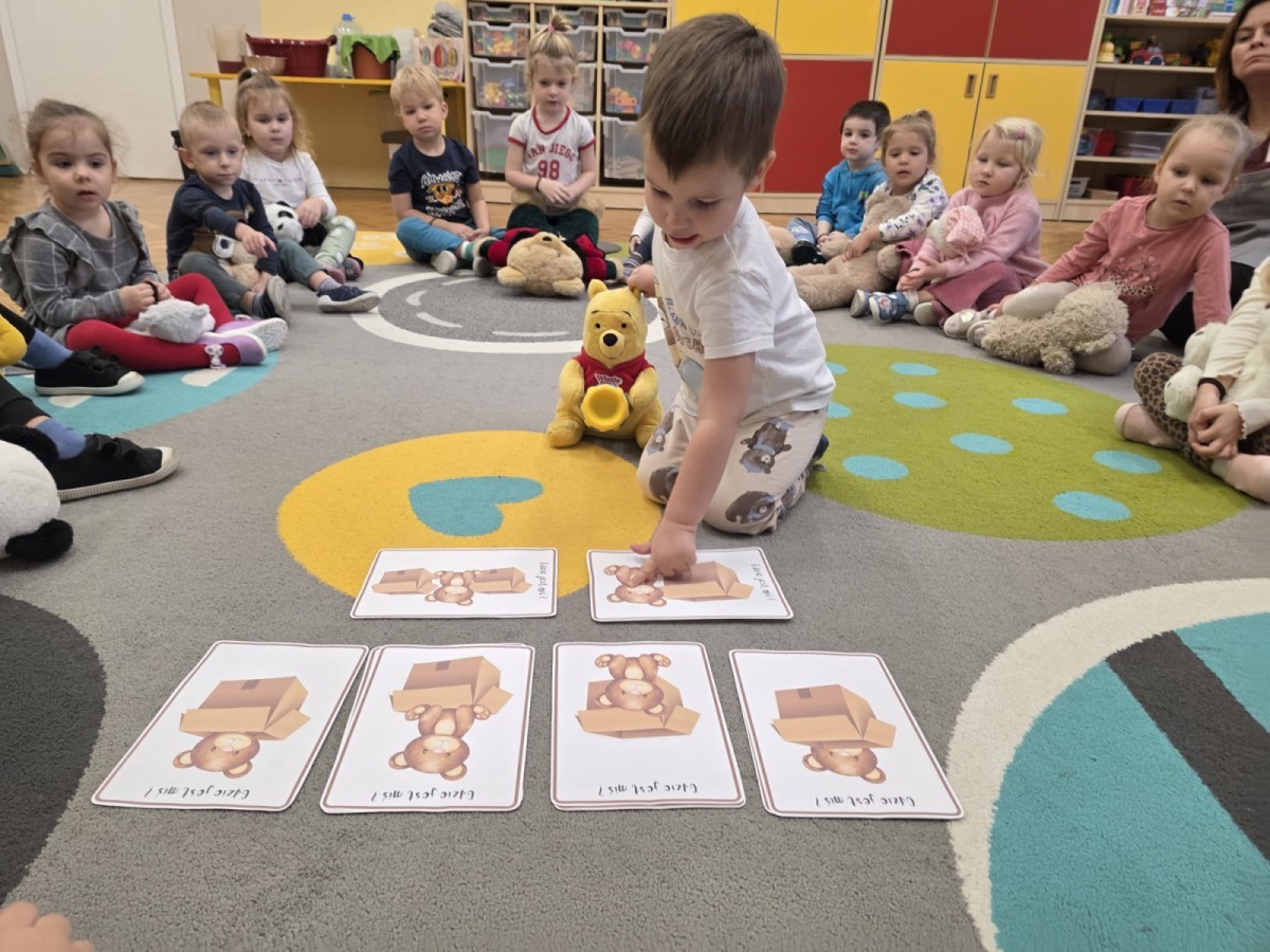 Dzieci z grupy Misie zaprezentowały swoje Misie, odgadywały i określały "Gdzie jest miś", grały w "Misiowe memorki". Potem wspólnie z grupą Biedronek bawiły się z Animatorkami, spotkały Kubusia Puchatka bawiły się, przytulały do Misia i zrobiliśmy wspólne zdjęcie.