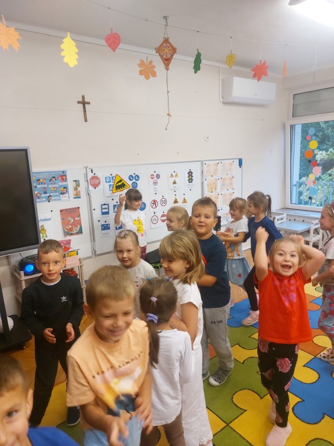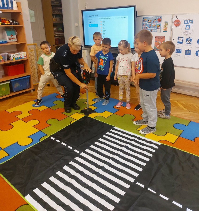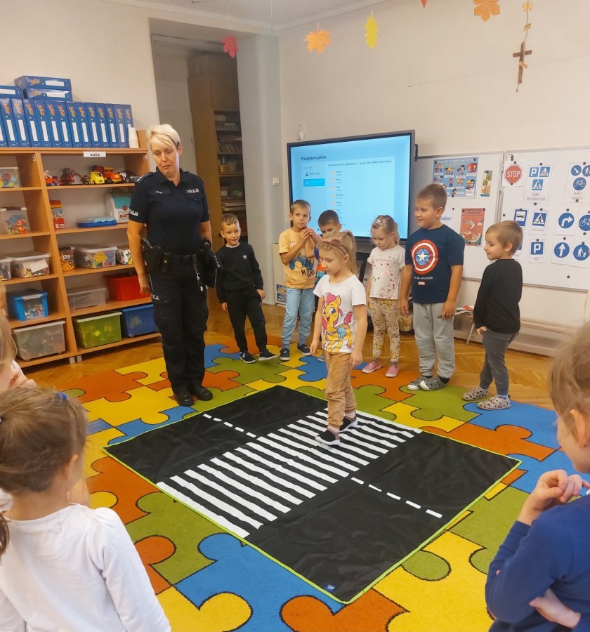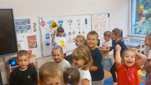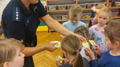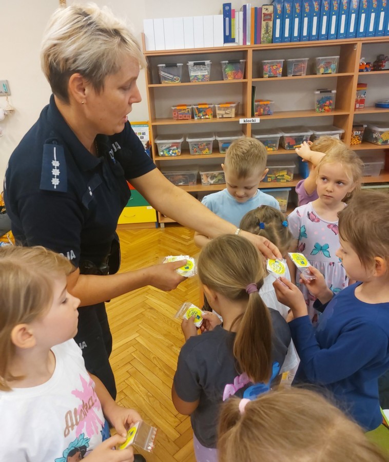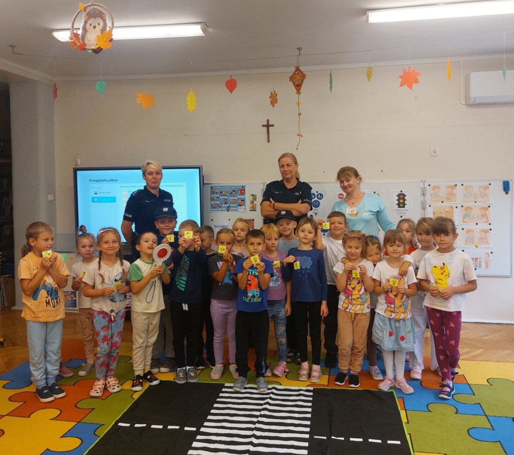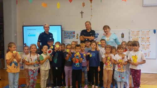 Grupę Kasztanków odwiedziły panie policjantki. Dzieci oglądały bajkę o bezpieczeństwie, utrwaliły zasady poruszania się w ruchu ulicznym w sposób, aby nie powodowało to zagrożeń dla żadnego uczestnika ruchu, dostały upominki w postaci naklejek. Znaki drogowe oraz zachowanie w kontaktach z obcą osobą nie stanowią dla Kasztanków problemu. Jesteśmy bezpieczni!