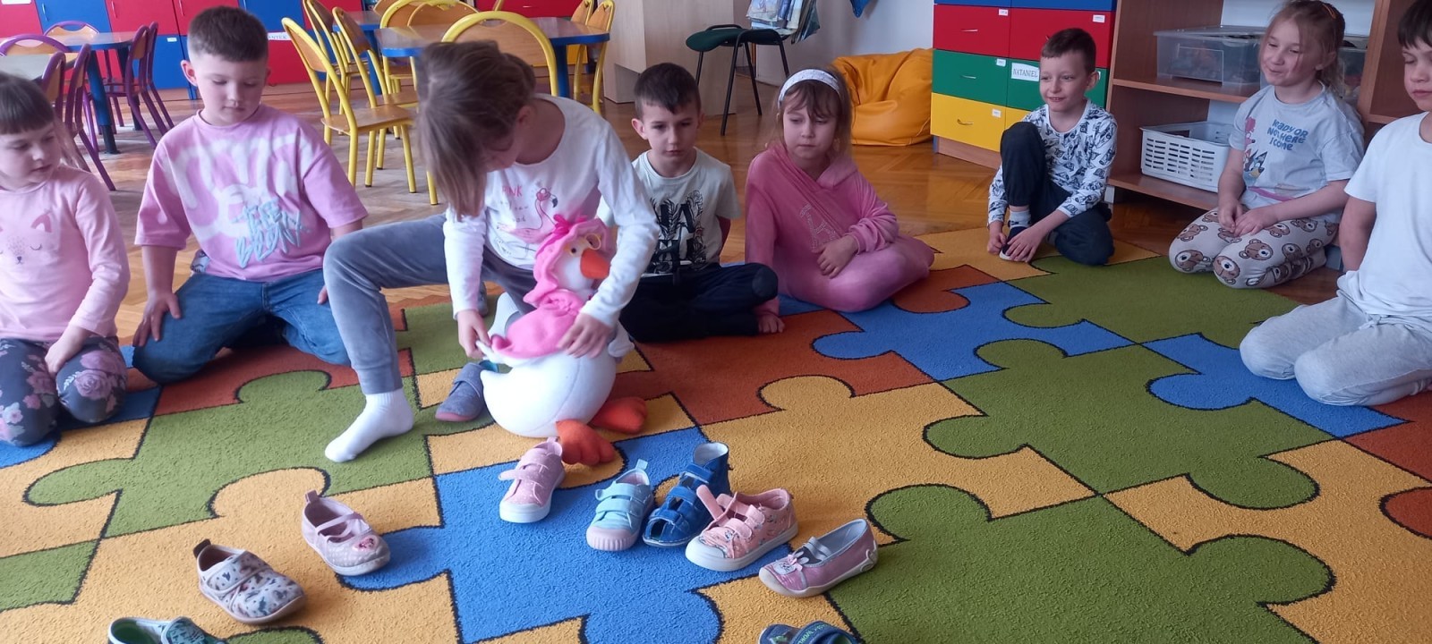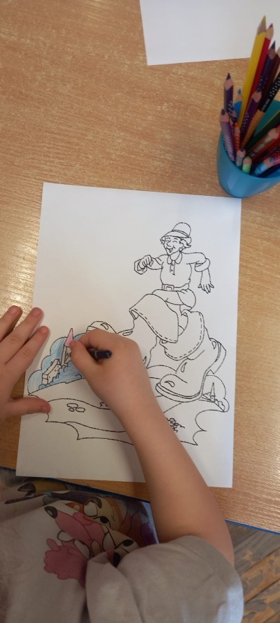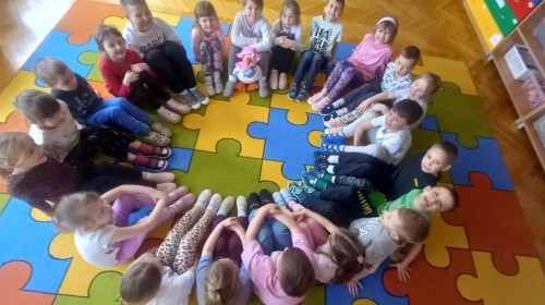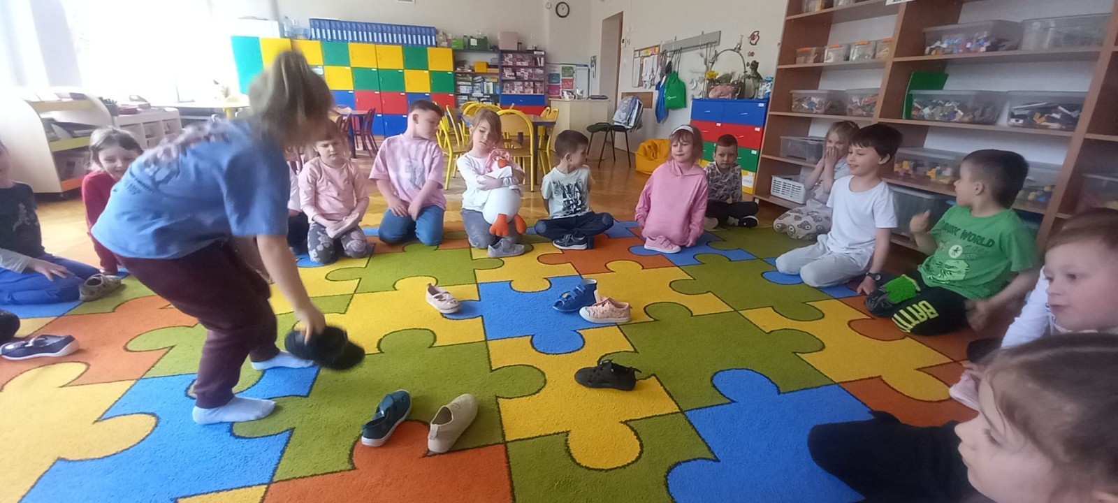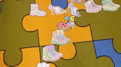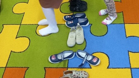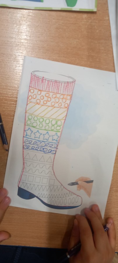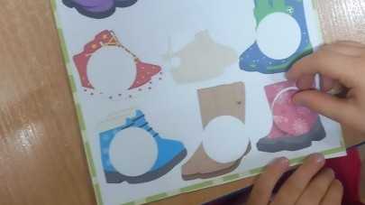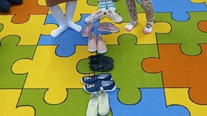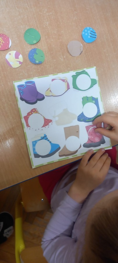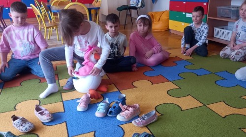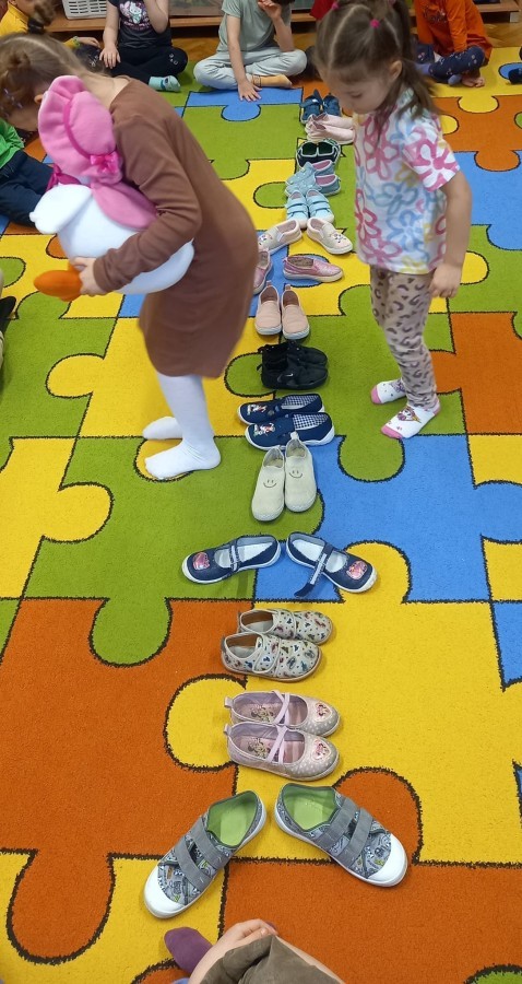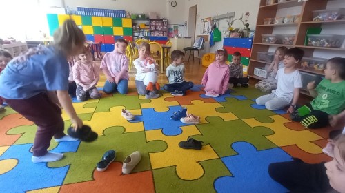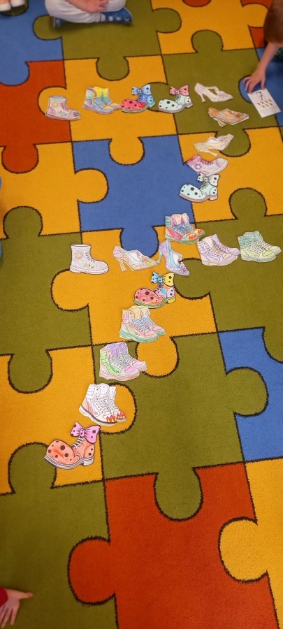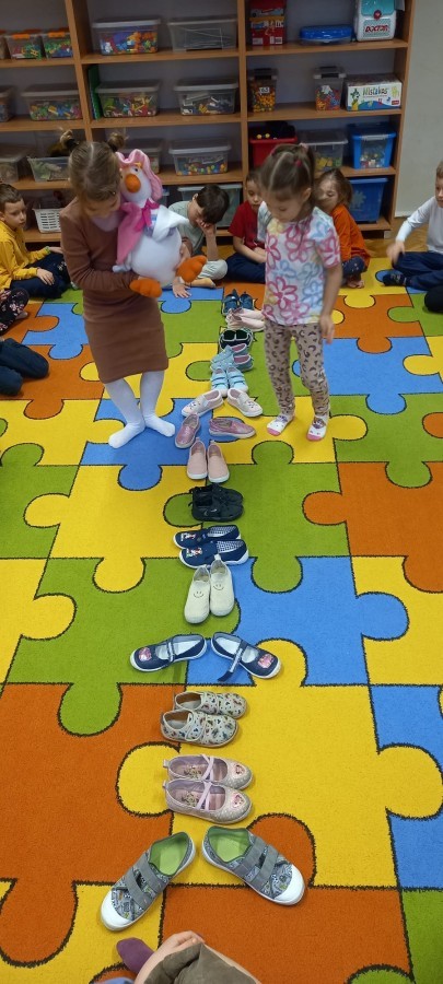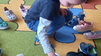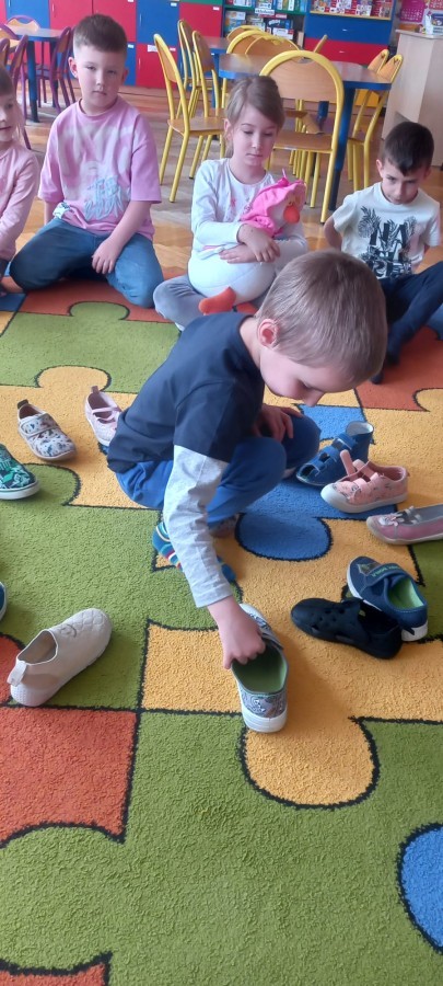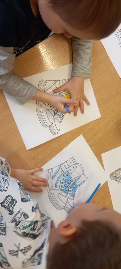 Ruch i spostrzegawczość: Zabawa „Czyj to but?” - ćwiczenia w dopasowywaniu par sprawdziły czujność dzieci. "Kolorowy but" - zabawa grafomotoryczna. Ćwiczyliśmy również wiązanie bucików a na koniec każdy kolorował wybrany "magiczny" but podczas prac plastyczno-technicznych.
