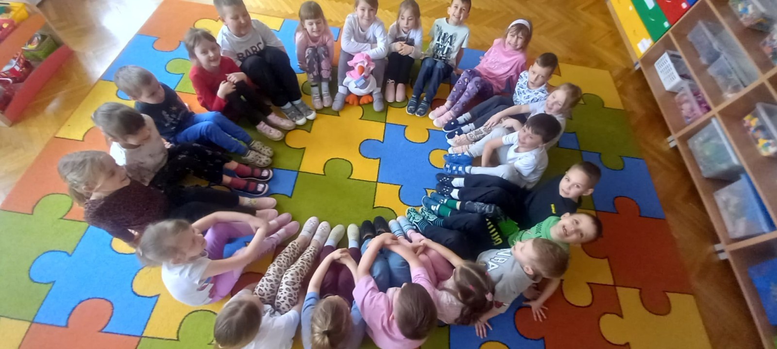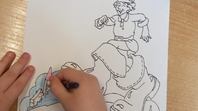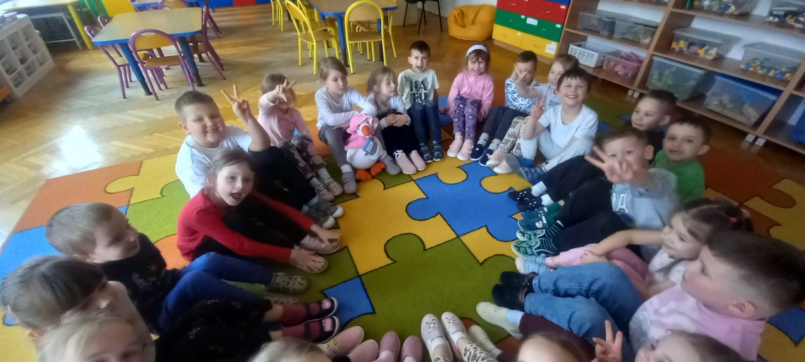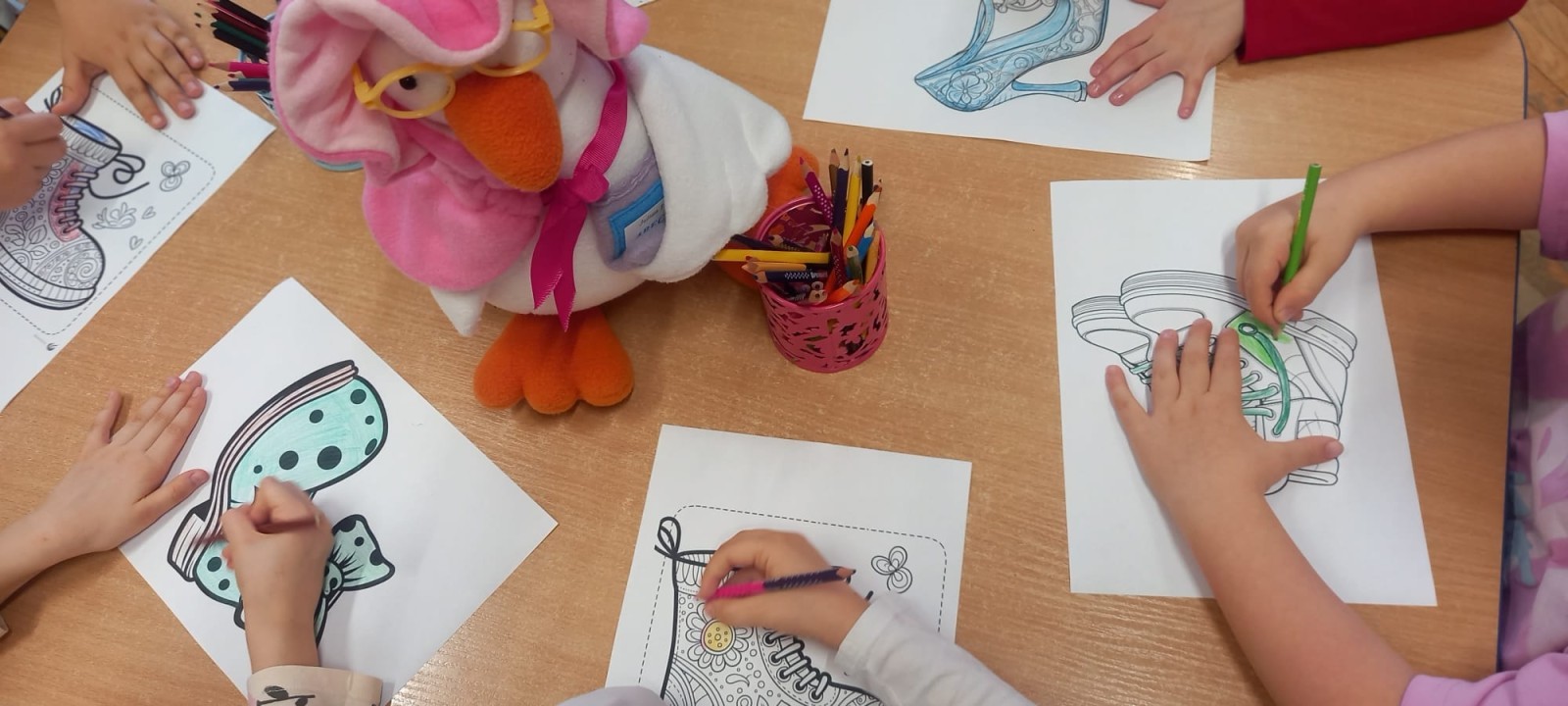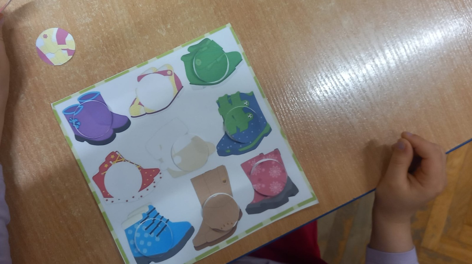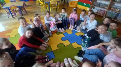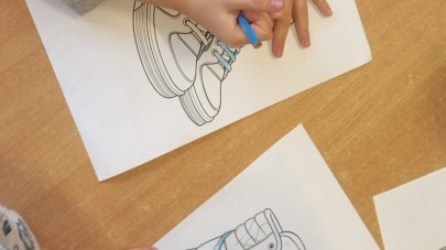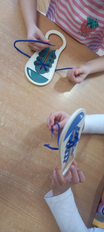 Ruch i spostrzegawczość: Zabawa „Czyj to but?” - ćwiczenia w dopasowywaniu par sprawdziły czujność dzieci. "Kolorowy but" - zabawa grafomotoryczna. Ćwiczyliśmy również wiązanie bucików a na koniec każdy kolorował wybrany "magiczny" but podczas prac plastyczno-technicznych.